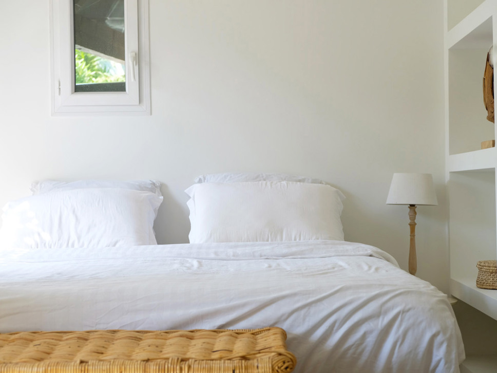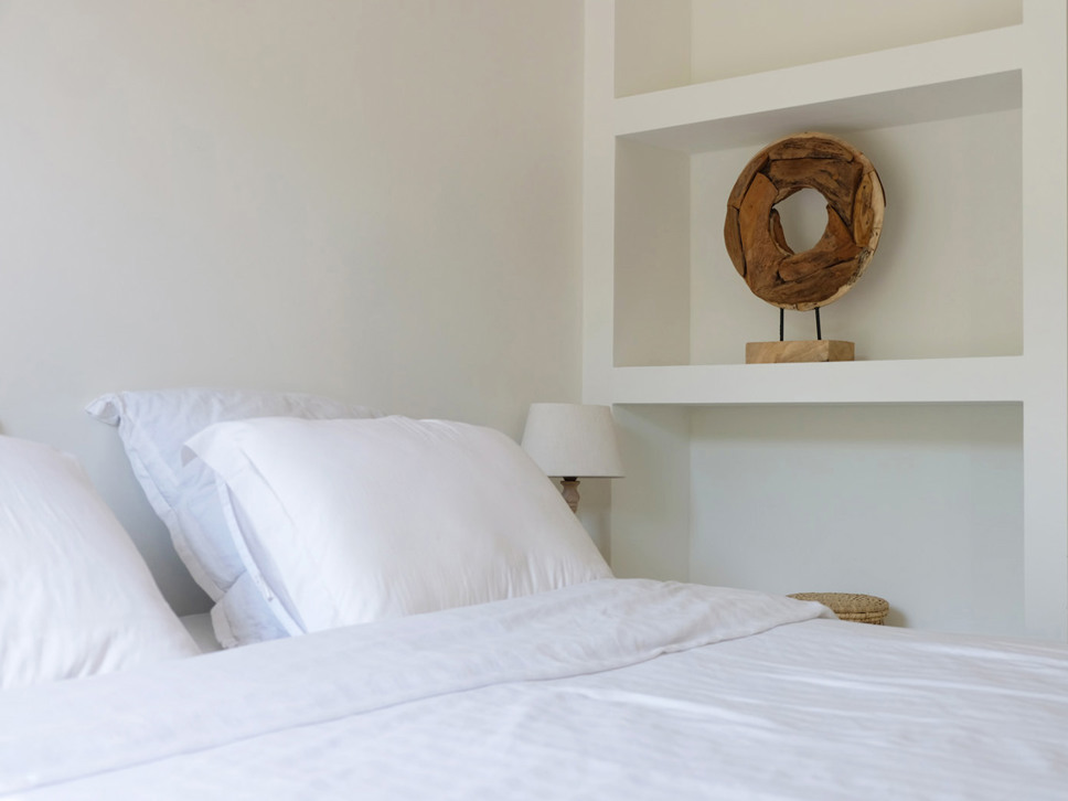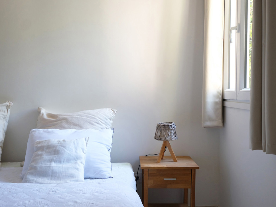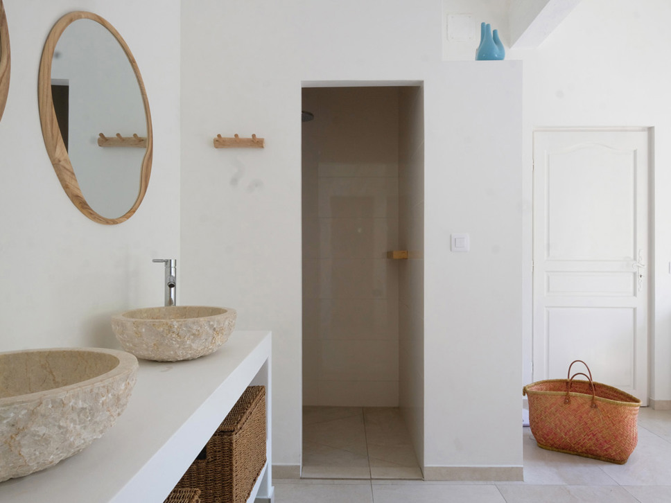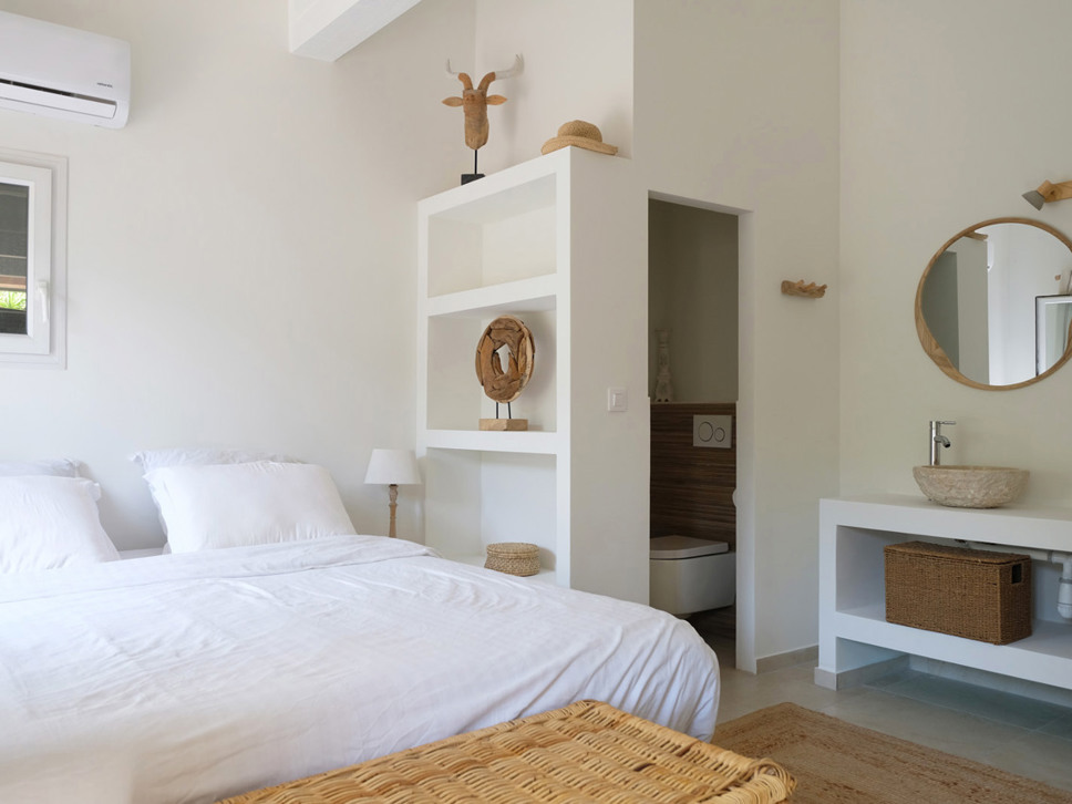 Het privézwembad (8 x 4 m, diepte van 0.90 tot 2.40 m) is direct toegankelijk vanaf het terras. Aan de ene korte zijde staan ligbedden en parasols, terwijl aan de andere zijde een comfortabele loungeset staat, vanwaar u zelfs een glimp van zee kunt opvangen. Een buitendouche is eveneens aanwezig.