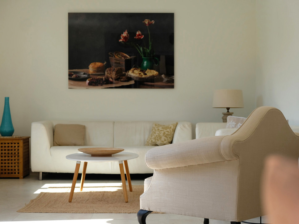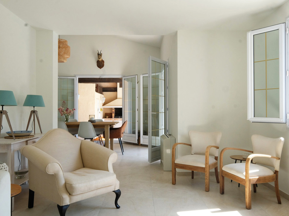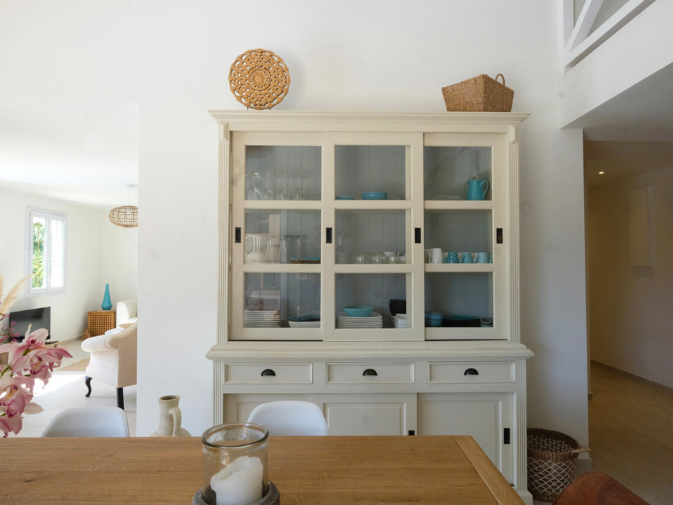 De villa beschikt over een modern ingerichte woonkamer met een comfortabele zithoek. Aansluitend bevindt zich de eetkamer, die via openslaande deuren direct toegang biedt tot het overdekte terras.