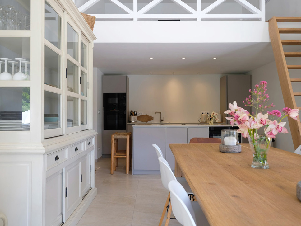 De living en keuken openen tot zowel het terras aan de voorzijde als ook het overdekte terras naast de keuken waar een 2e eettafel staat.