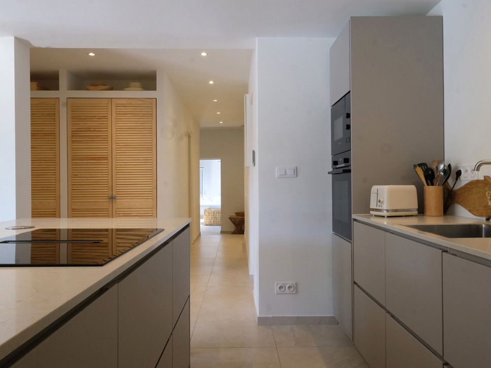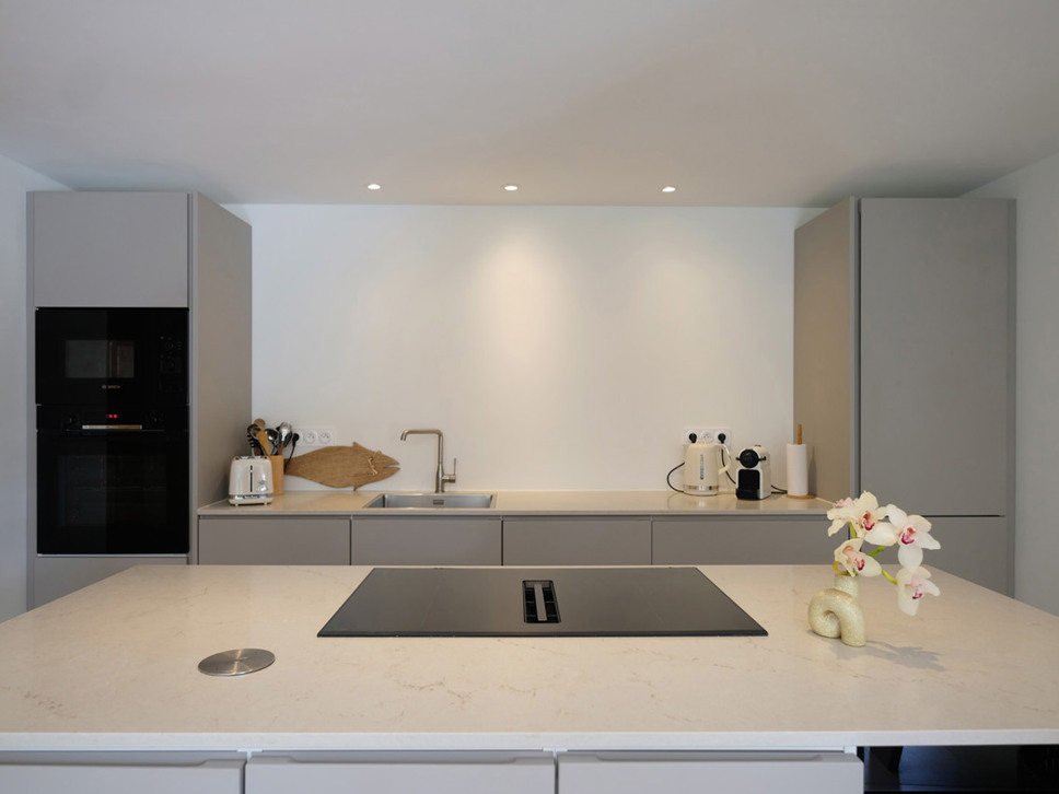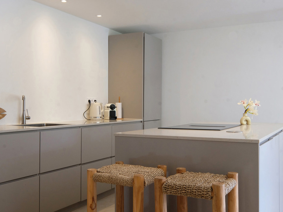 De open keuken met kookeiland is luxe, modern en compleet ingericht met onder andere een vaatwasser, oven, magnetron, hoge koelkast met apart vriesvak en Nespresso koffiezetapparaat.