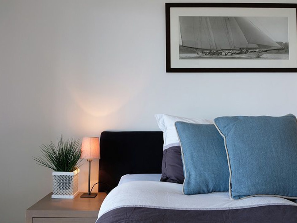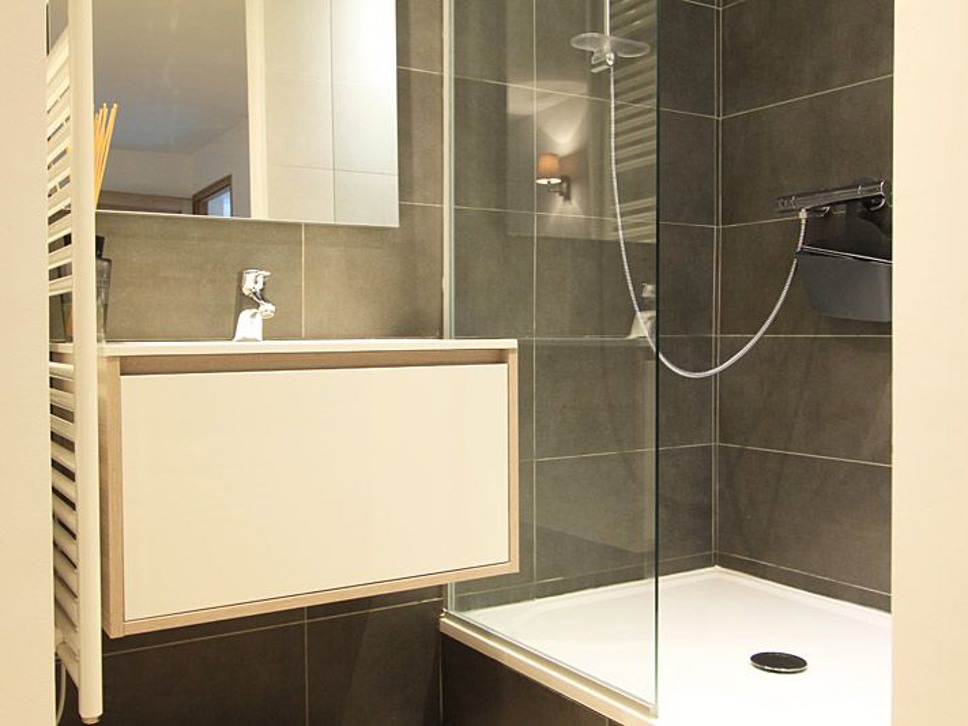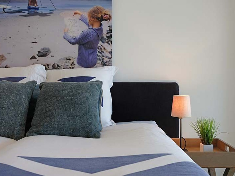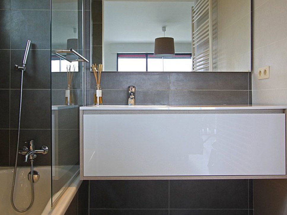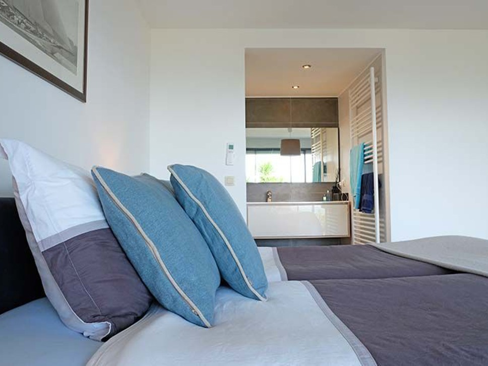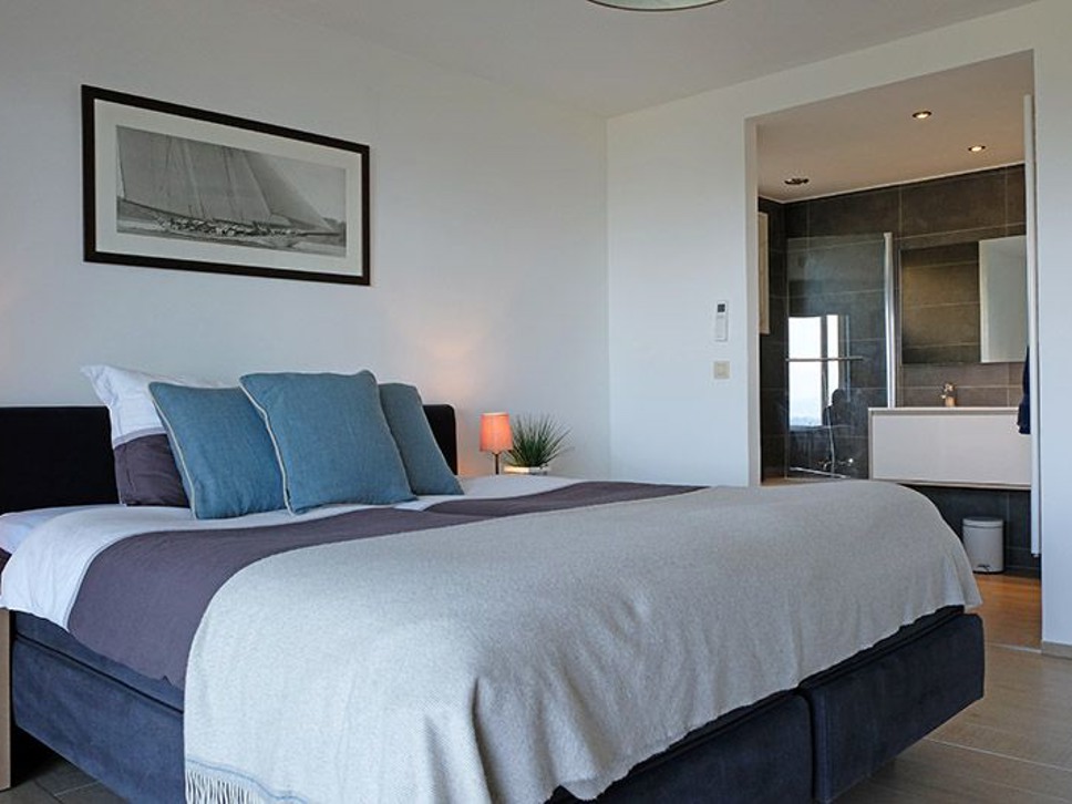 Slaapkamer 2 is een ruime kamer met zeezicht. Grote schuifdeuren die toegang geven tot het terras. Het tweepersoonsbed is boxspring (2x90x210). De badkamer is separaat op de gang en biedt een douche en mooie wastafel.