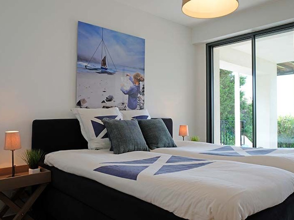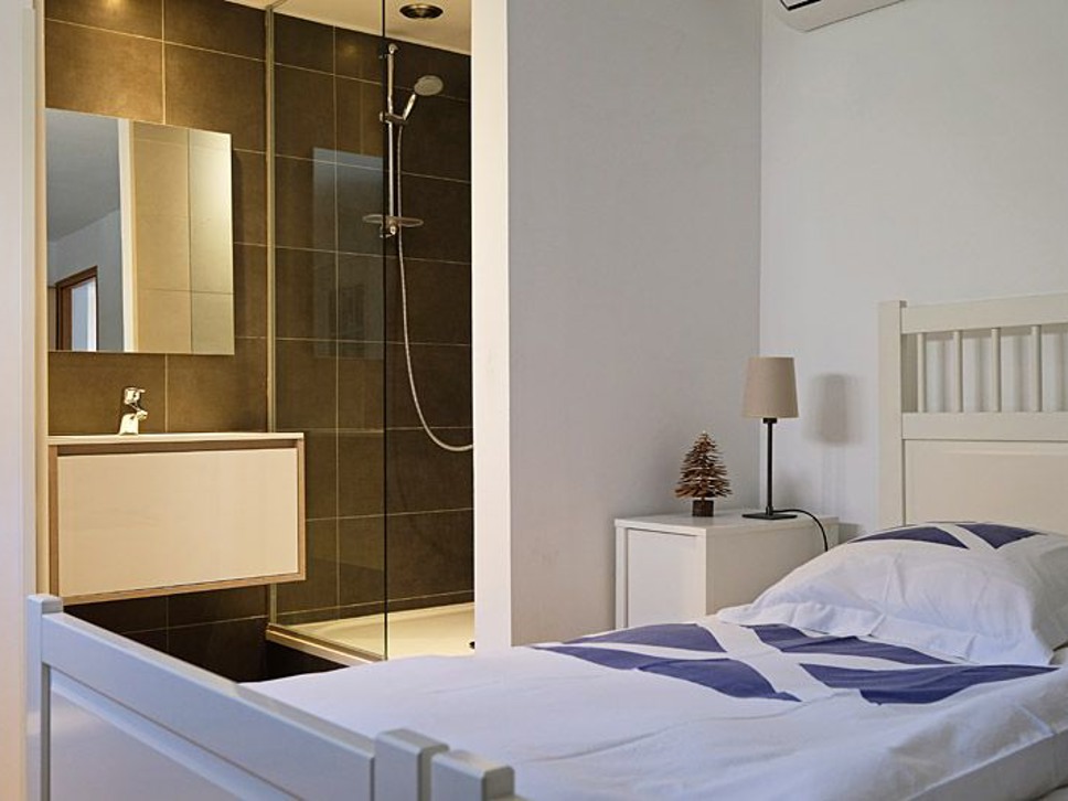 Er zijn 3 slaapkamers en 3 badkamers. Alle slaapkamers zijn gelegen op de beneden verdieping. Alle slaapkamers zijn voorzien van airconditioning. Slaapkamer 1 is gelegen aan de zeezijde van de villa. De grote schuifdeuren bieden toegang tot het stenen terras. Het bed is een fraaie boxspring (2x90x210). U wordt wakker met fraai zicht op Middellandse zee. De moderne badkamer is en-suite en heeft een bad, en douche in bad en mooie wastafel.
