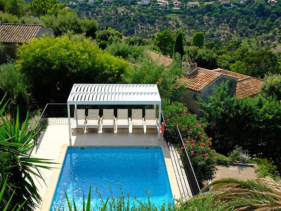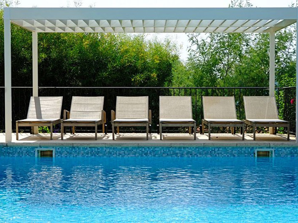 Een niveau lager dan de villa, te bereiken via een afgesloten doch ietwat stijle trap, ligt het zwembad (10 x 5 m.) met overdekt zonneterras. De zonligging is aantrekkelijk, de villa en het zwembad liggen pal op het zuiden. Het zwembad ligt heerlijk beschut en biedt veel privacy. De 6 ligbedden staan onder een fraaie moderne pergola. Een prima plek om te genieten en te ontspannen. De villa biedt verder een overdekte parkeerplaats.