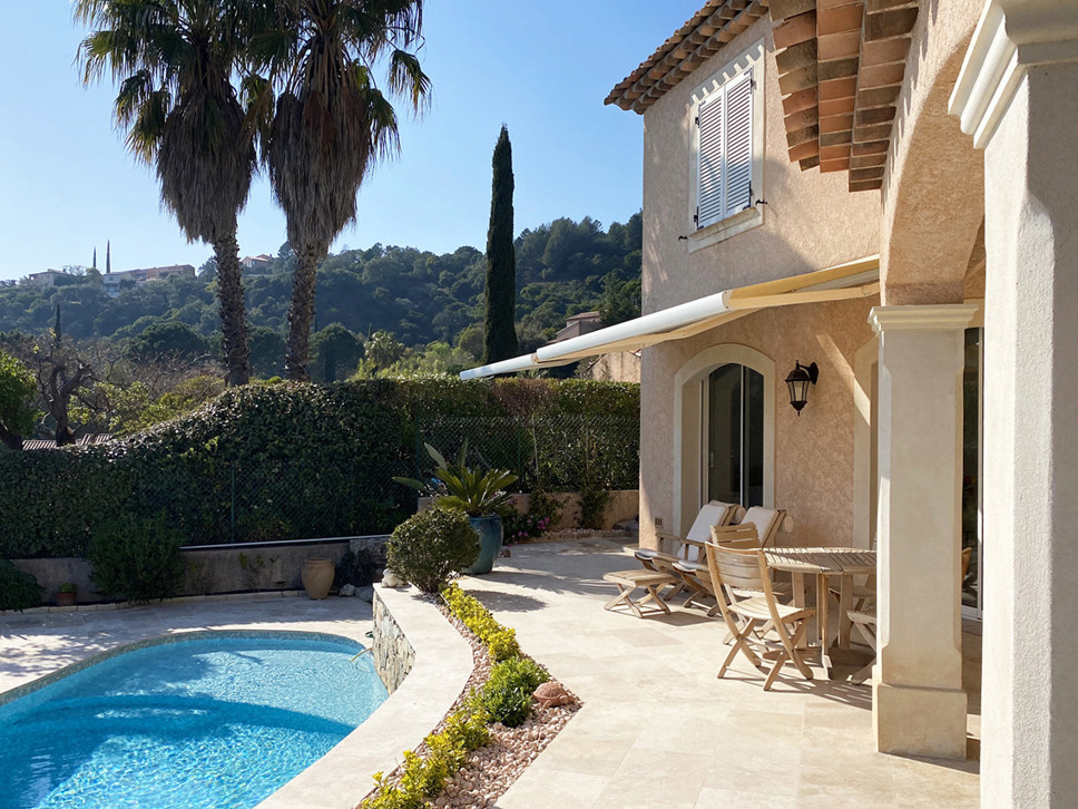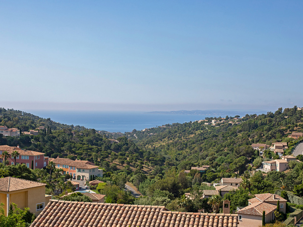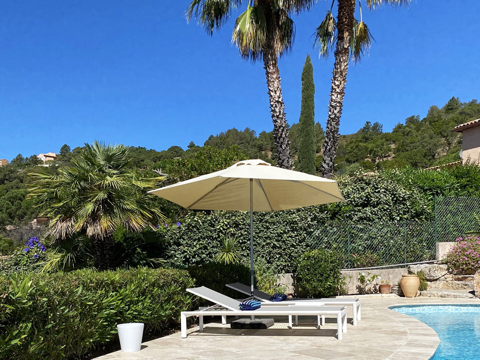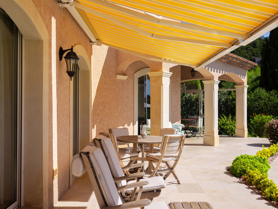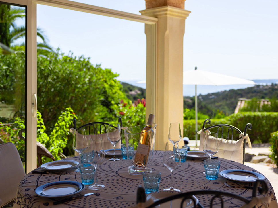 De villa biedt over de gehele breedte van de woning een mooi terras. Het uitzicht is over de groene vallei van Les Issambres naar de Middelandse Zee. Zowel vanuit de living als vanuit de eethoek heeft u direct toegang tot het terras. De zonneschermen zorgen voor de gewenste schaduw. Op het terras treft u een ronde eettafel met 4 stoelen. De ideale plek om de dag van start te gaan met een vers gezet kopje koffie!