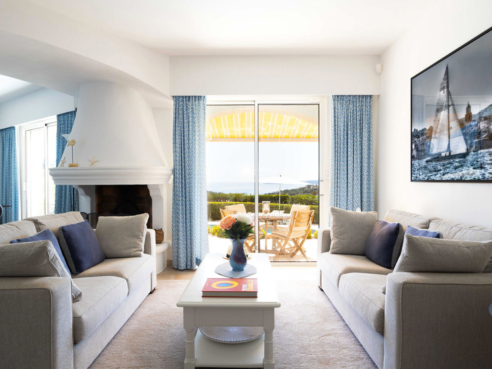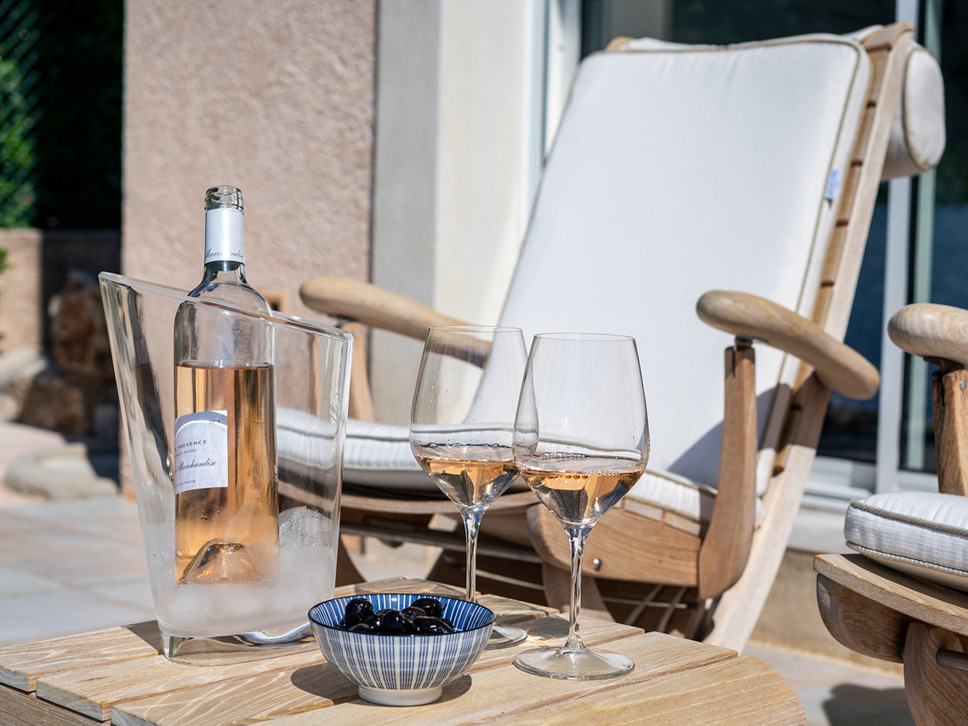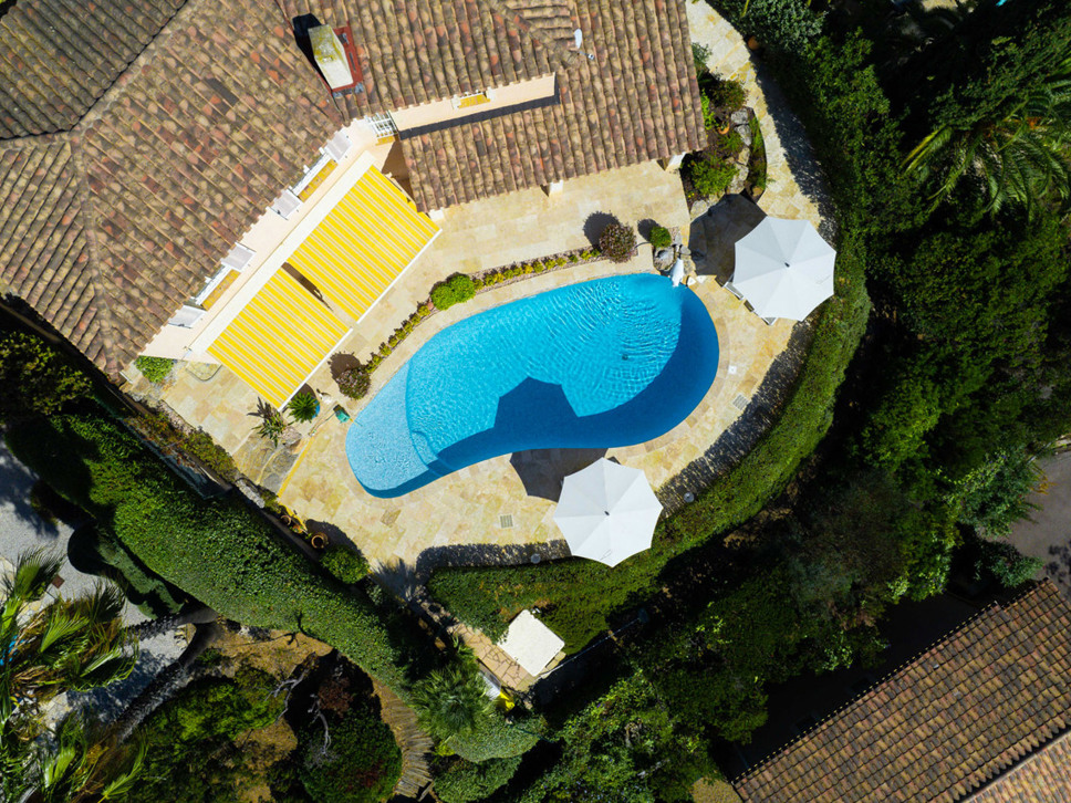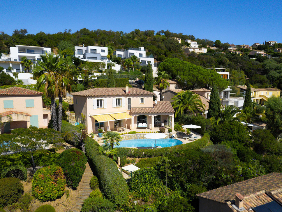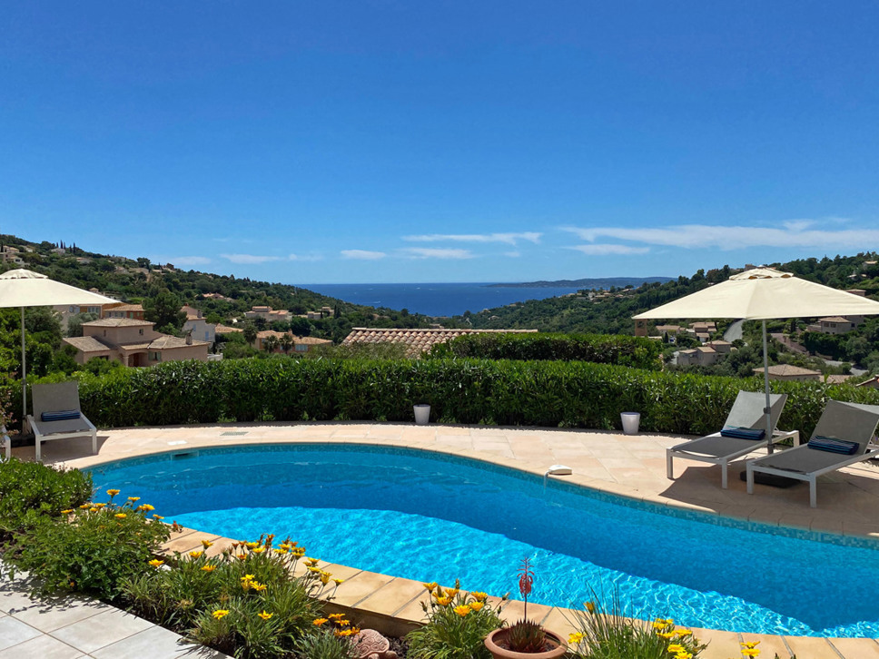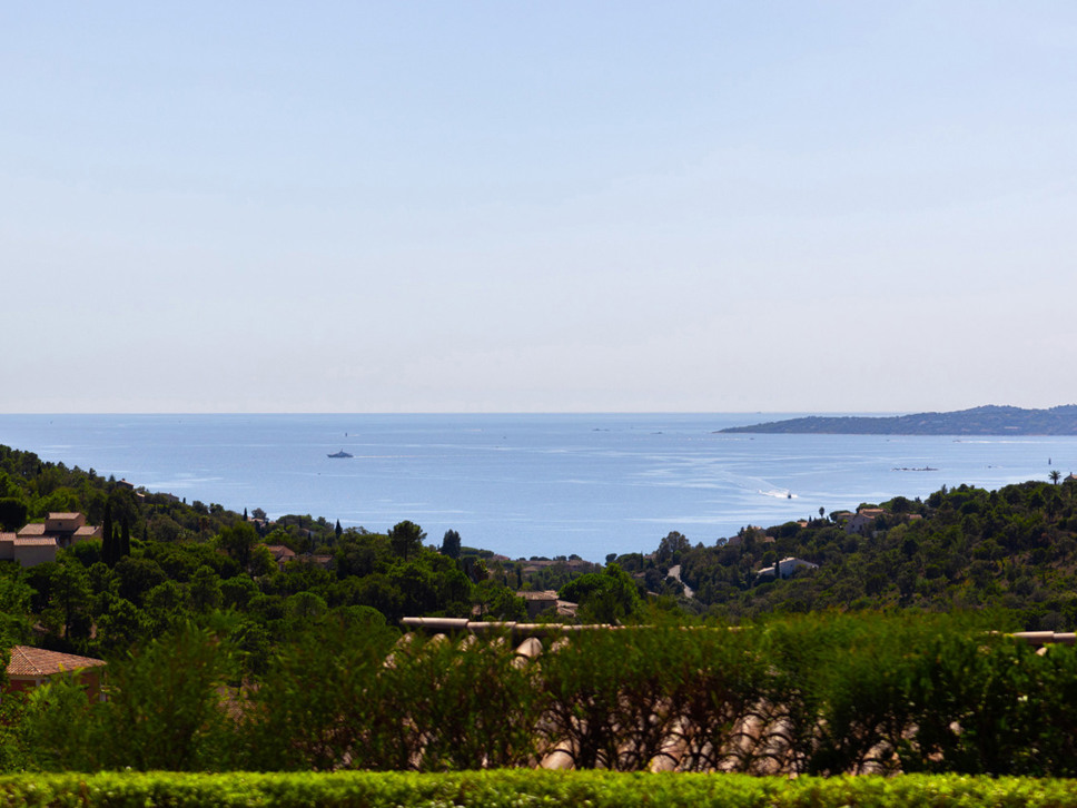 De villa biedt over de gehele breedte van de woning een mooi terras. Het uitzicht is over de groene vallei van Les Issambres naar de Middelandse Zee. Zowel vanuit de living als vanuit de eethoek heeft u direct toegang tot het terras. De zonneschermen zorgen voor de gewenste schaduw. Op het terras treft u een ronde eettafel met 4 stoelen. De ideale plek om de dag van start te gaan met een vers gezet kopje koffie!