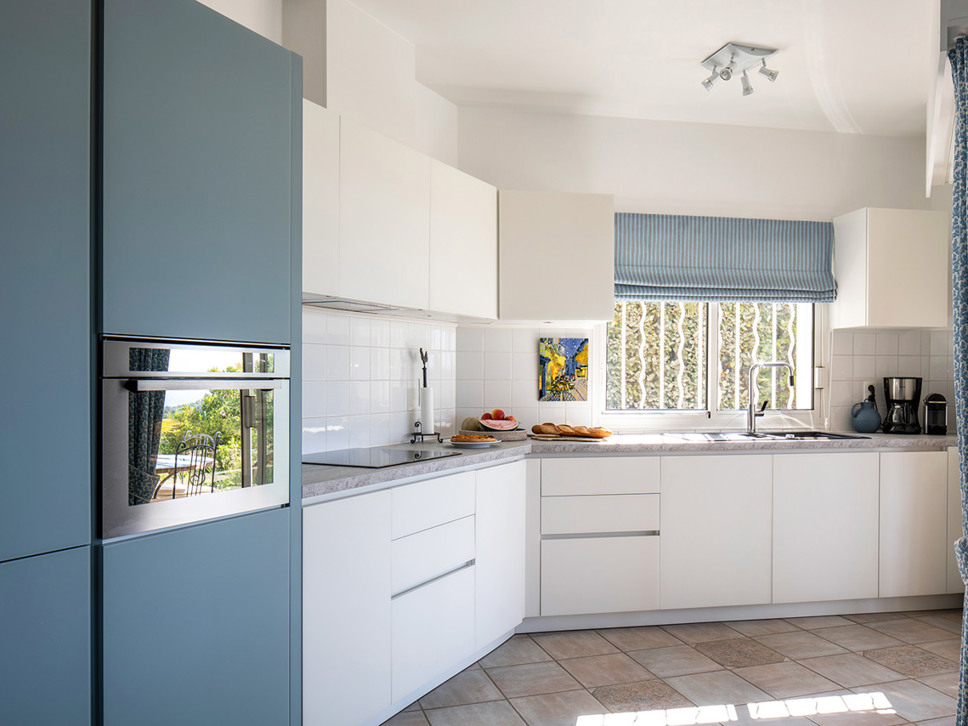 De open moderne keuken is van alle gemakken is voorzien; een koelkast, magnetron, oven, afwasmachine, waterkoker en koffiezetapparaat. Vanuit de keuken heeft u, tevens via glazen schuifdeuren, toegang tot het overdekte terras. De villa is geheel voorzien van airconditioning.