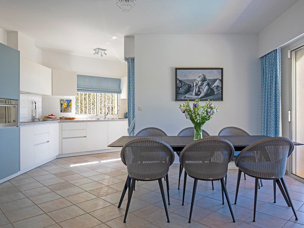 Vanuit de keuken heeft u toegang tot het overdekte terras. Hier staat een tweede ronde eettafel met voldoende stoelen. Vanuit hier heeft u zicht op het zwembad alsook een fraai uitzicht over de heuvels richting zee. Heerlijk om 's morgens te ontbijten en s'avonds uitgebreid te tafelen en te genieten van de laatste zonnestralen.