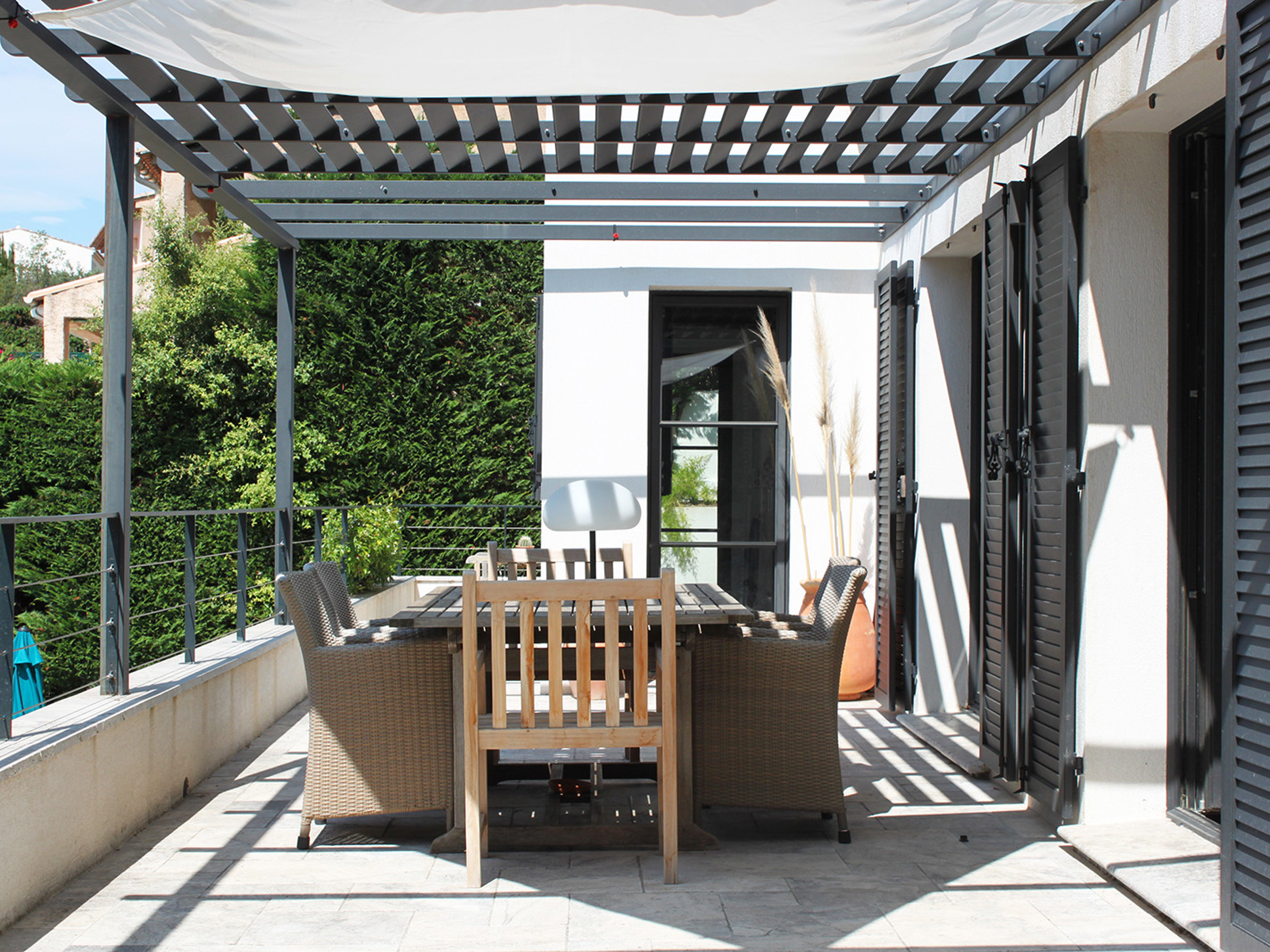 De living sluit via 2 openslaande deuren aan op het ruime natuurstenen terras met daarop een grote teakhouten eettafel met comfortabele stoelen onder een pergola van 3 x 4 meter.