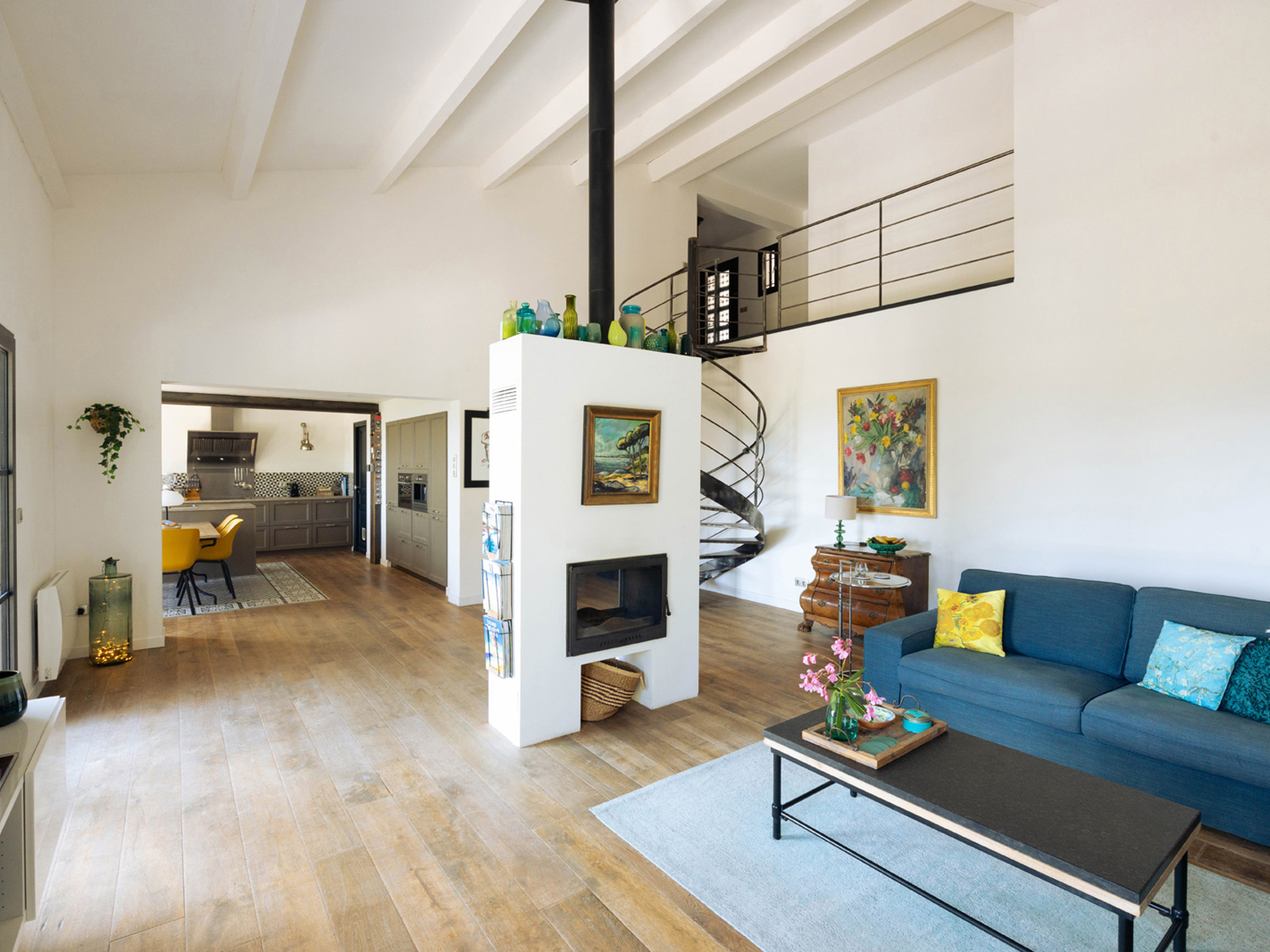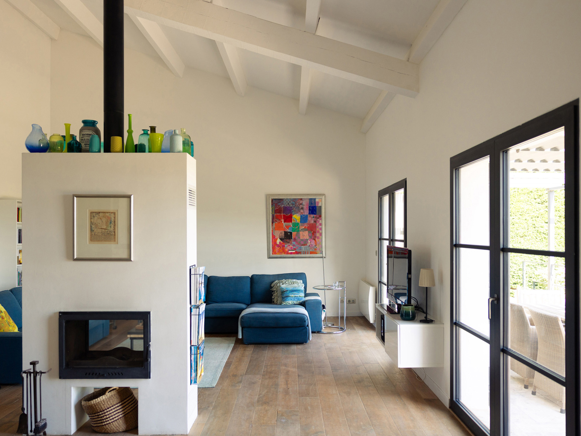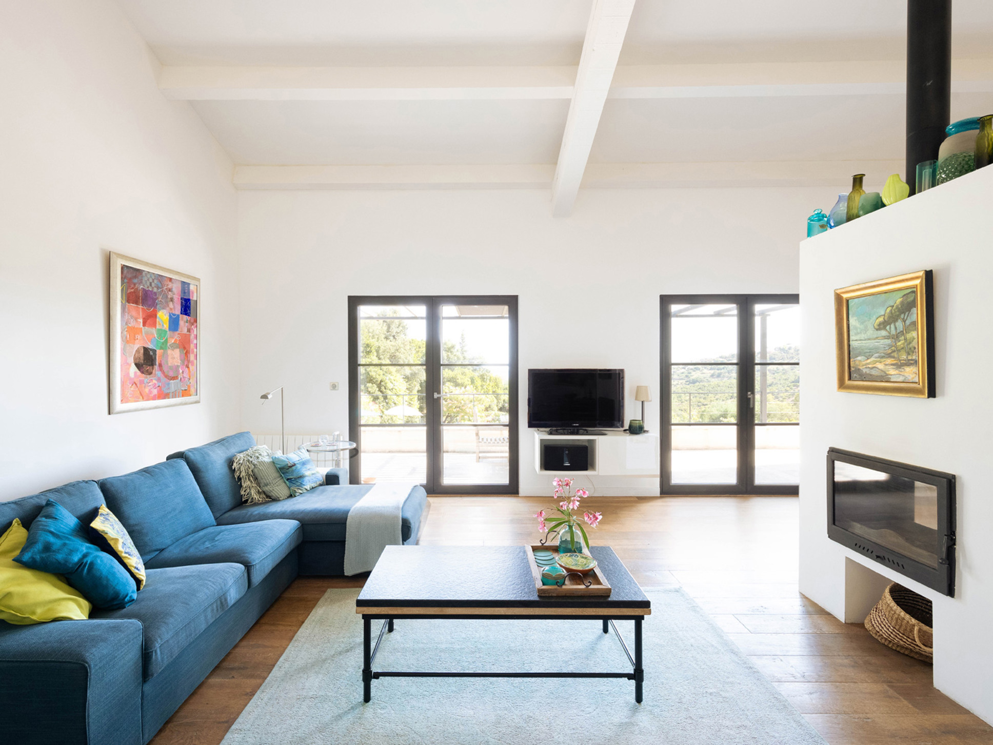 De royale living met aansluitend een open woonkeuken bevindt zich direct aan het hooggelegen terras vanwaar men op het zwembad kan kijken. Een combinatie van moderne en antieke meubelen en echte kunst zorgt voor een eclectische touch.