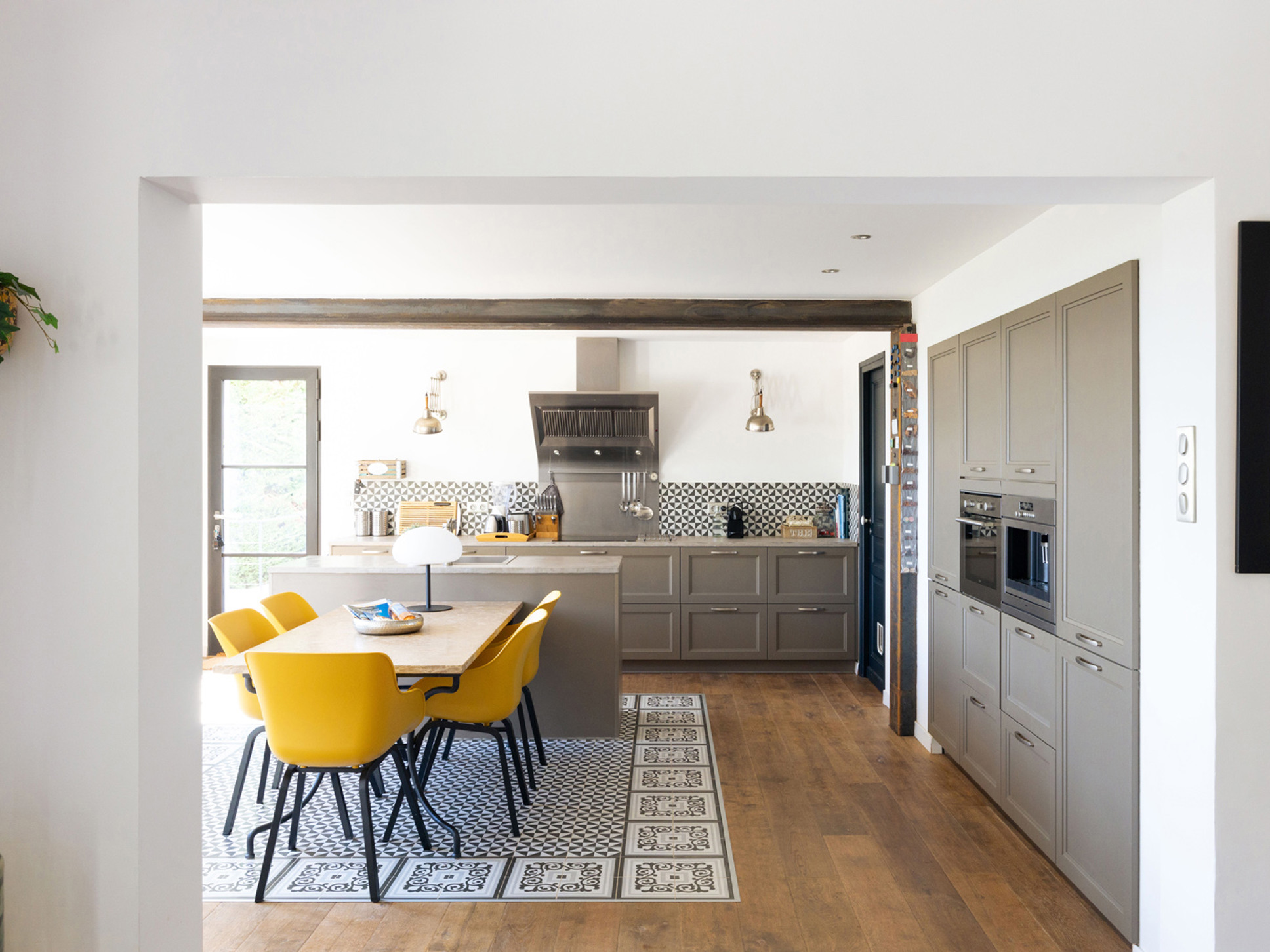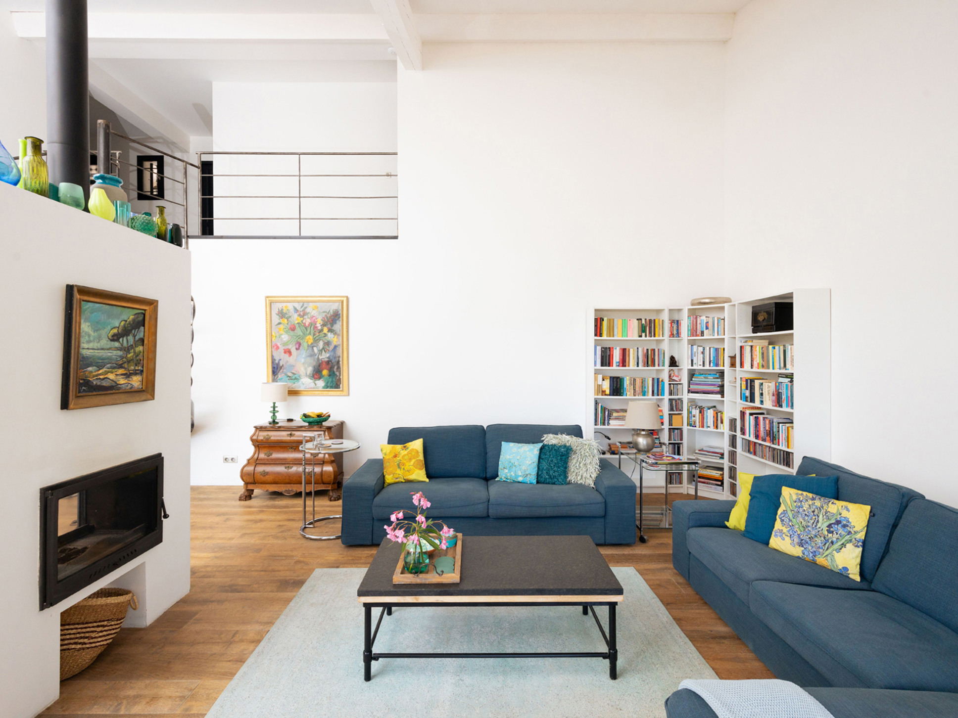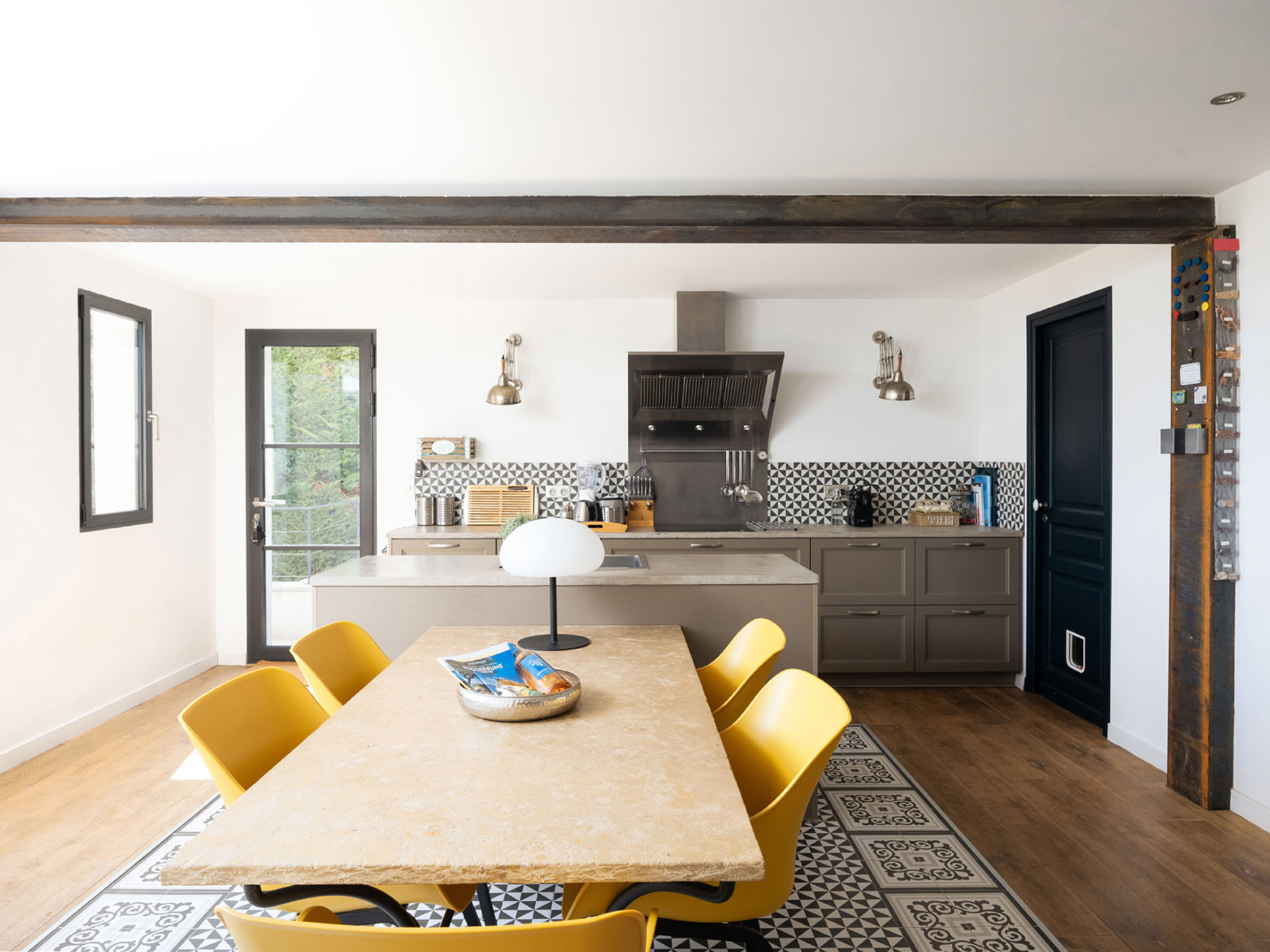 De royale living met aansluitend een open woonkeuken bevindt zich direct aan het hooggelegen terras vanwaar men op het zwembad kan kijken. Een combinatie van moderne en antieke meubelen en echte kunst zorgt voor een eclectische touch.