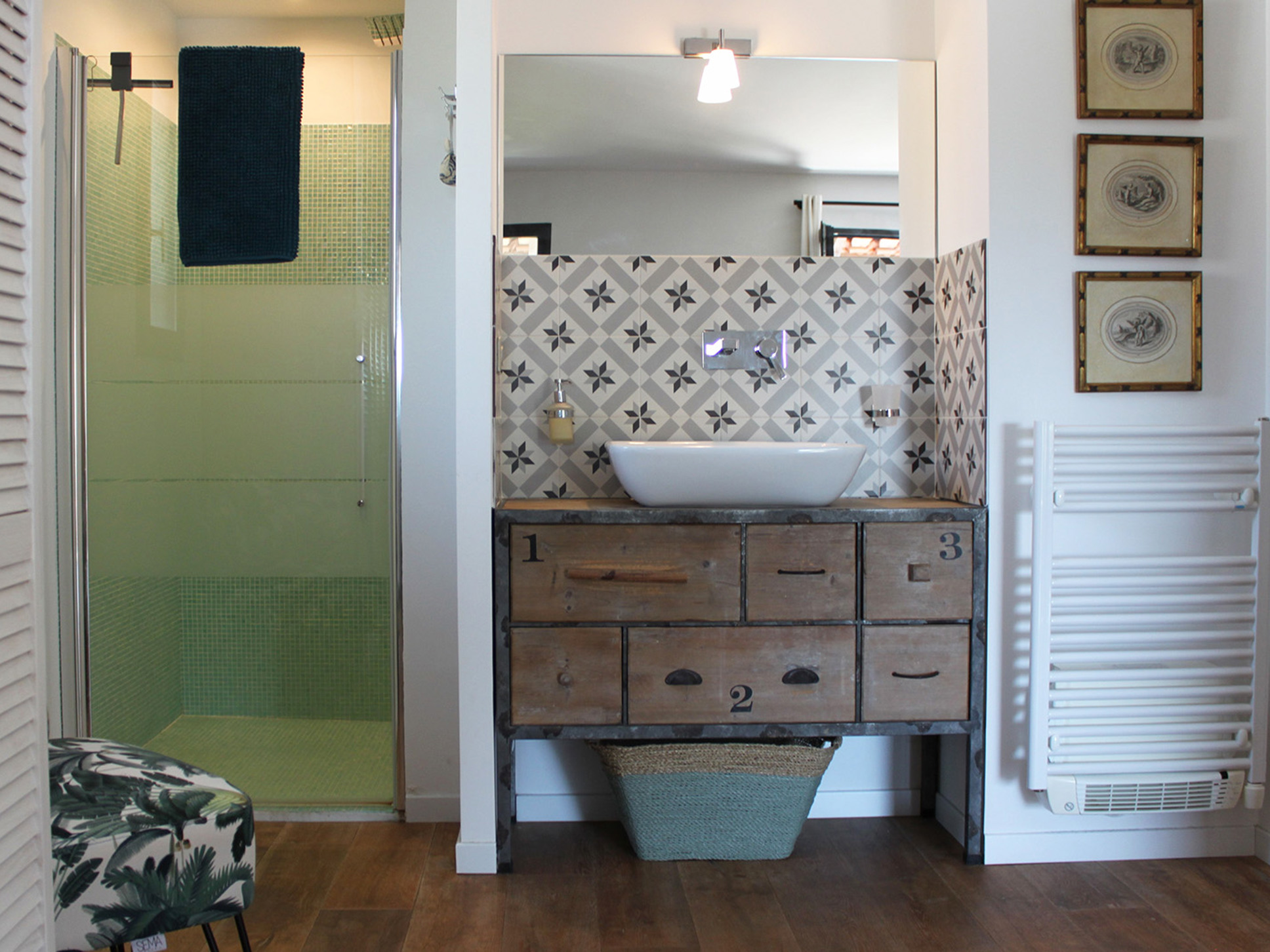 Slaapkamer 1 is de ouderslaapkamer. U geniet van een eigen overdekt terras op het zuiden, met zitje van waar u een prachtig uitzicht heeft. De badkamer is en-suite (ligbad, wastafel en inloopregendouche).