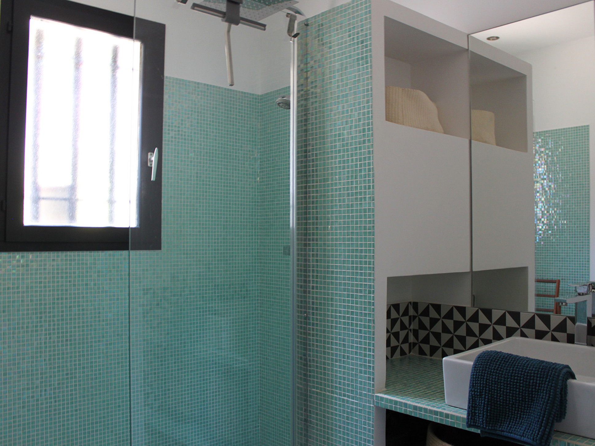 Slaapkamer 2 & 3 bieden tweepersoons boxsprings van respectievelijk 2x90x200 en 160x200. De kamers delen een badkamer (inloopregendouche) en separaat toilet. Beiden slaapkamers hebben openslaande deuren naar het noordterras. De 3e badkamer bevindt zich op het niveau van de living en bestaat uit een regendouche en toilet.