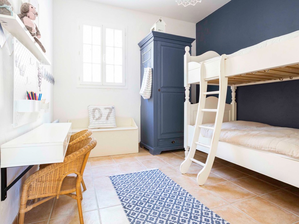 Op slaapkamer 3, de kinderkamer, staat een stapelbed (2x90x200). Slaapkamer 4 heeft een tweepersoonsbed (160x200) en ook op slaapkamer 5 staat een tweepersoonsbed (160x200). Drie van de 4 slaapkamers beneden hebben openslaande deuren naar de tuin en het zwembad. Slaapkamers 3,4 en 5 delen één badkamer (douche, bad). Er zijn dus 2 badkamers op deze verdieping. Ook is er een separate W.C. op deze verdieping.