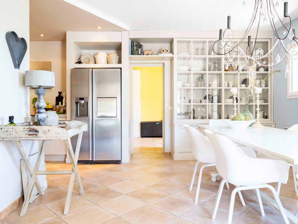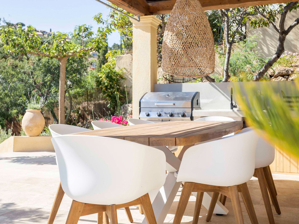 Vanuit de living is er rechtstreeks toegang tot het (gedeeltelijk) overdekt terras. Op dit terras staat een eettafel met 10 stoelen en een comfortabele zithoek. Dit is de plek bij uitstek om te genieten van een diner met vrienden, uitkijkend over de heuvels naar de Middellandse Zee.