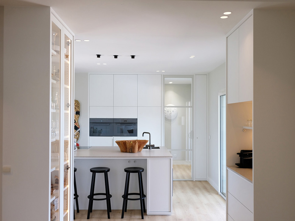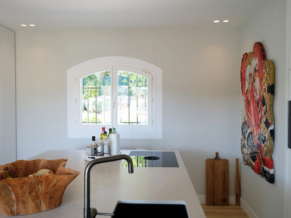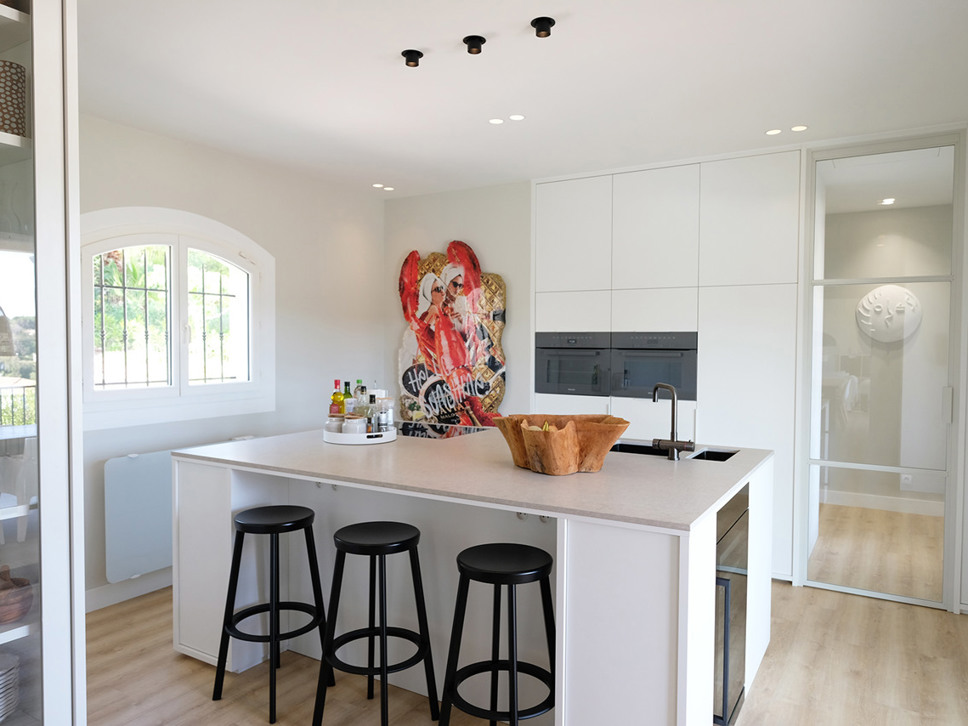 De moderne keuken is voorzien van een koelkast, vriezer, vaatwasser, oven, magnetron, kokendwaterkraan en een wijnkast. Het kookeiland biedt extra werkruimte. In de bijkeuken staan een wasmachine, droger en een ijsblokjesmachine.