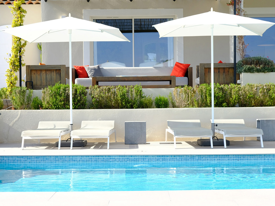 Bij het zwembad wacht een royaal zonnebed (200x200 cm), samen met zes ligbedden en parasols. Achter het overdekte poolhouse bevindt zich de buitendouche. De tuin is voorzien van kunstgras, perfect voor allerlei activiteiten.