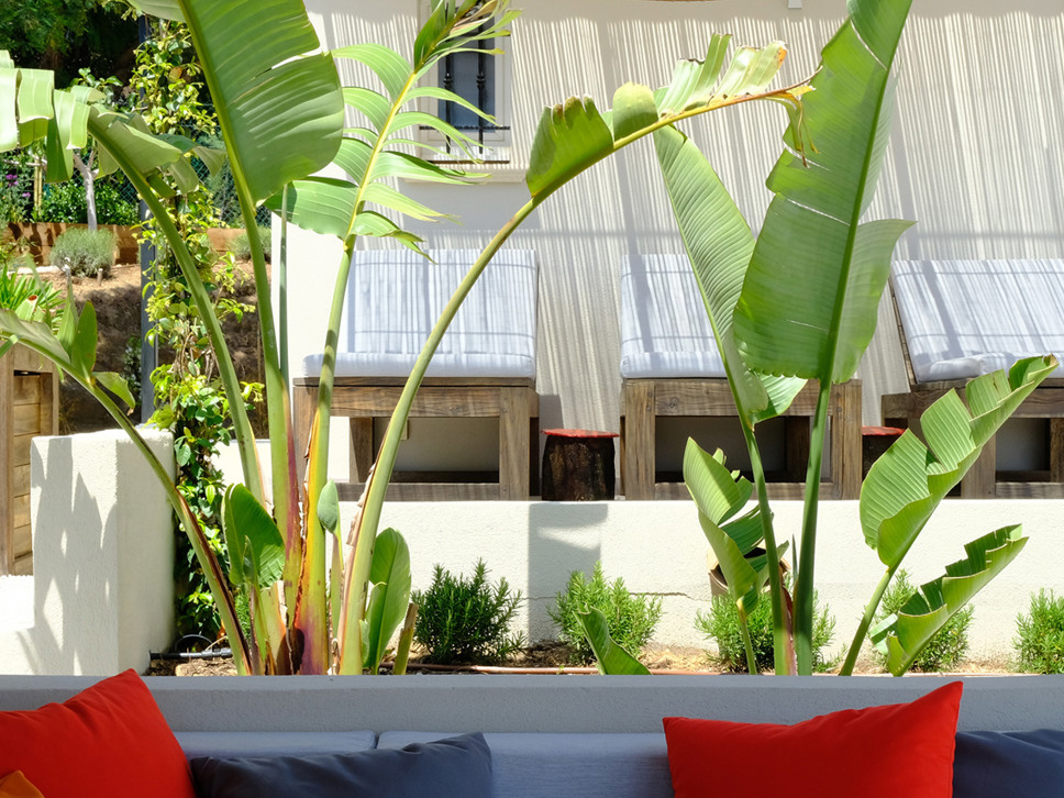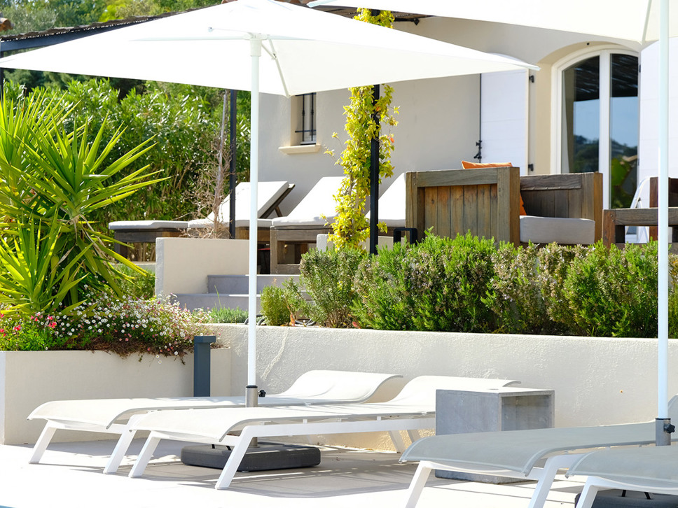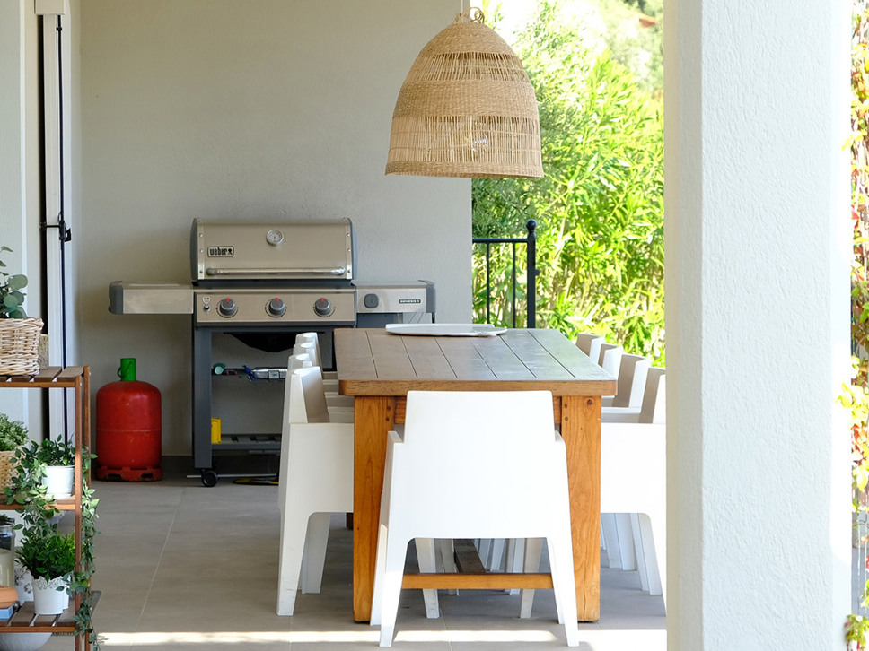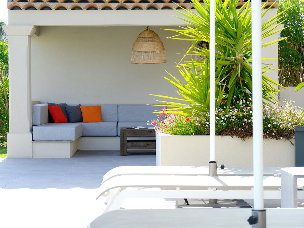 De tuin is een oase van comfort, met talloze, comfortabele zitjes. Het overdekte terras biedt een eettafel met plaats voor 8 personen en een Weber gasbarbecue. Onder twee rietgedekte pergola's, die voor verkwikkende schaduw zorgen, vindt u een stijlvolle loungeset en drie ligbedden.