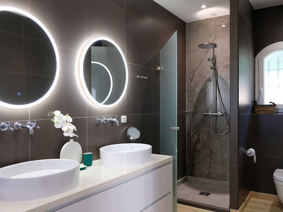 Slaapkamer 1, (begane grond), voorzien van een tweepersoonsbed (180x200). En-suite badkamer met ligbad, douche, twee wastafels en toilet. Toegang tot terras en zwembad via openslaande deuren.