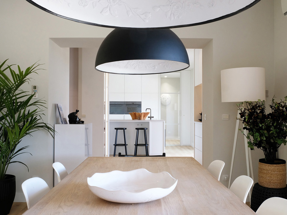 Bij binnenkomst bevindt zich links de living en rechts de moderne keuken met aansluitend de bijkeuken. De living bestaat uit een royale luxe zithoek, een eetgedeelte en een bureau.
