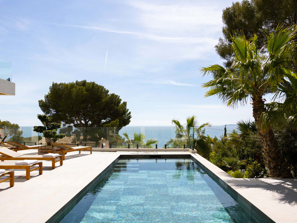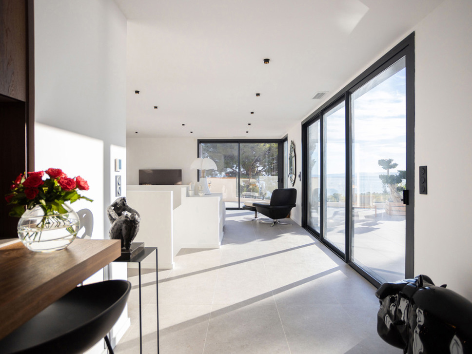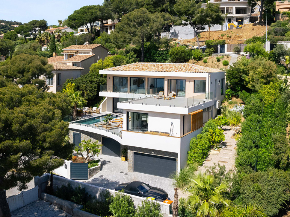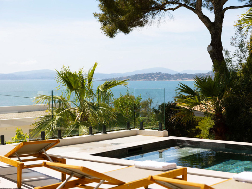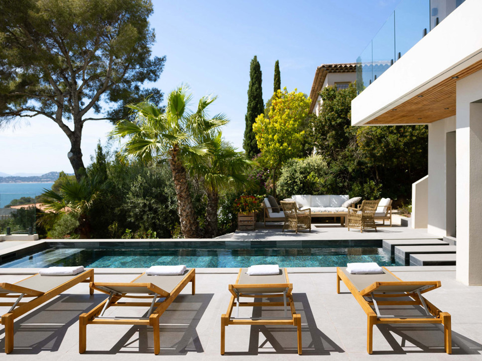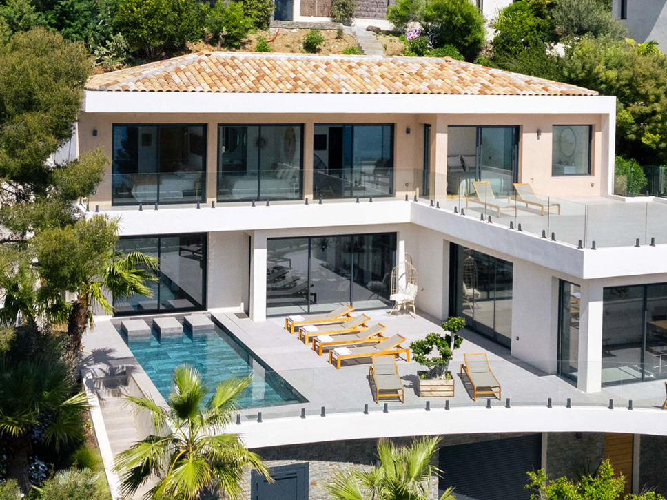 Exclusieve villa met privézwembad te Les Issambres, Côte d'Azur. Onder architectuur ontworpen villa. Royale slaapkamers, lift voorziening, luxe en-suite badkamers, design meubilair en met privégym. Het panoramische uitzicht op de Middellandse Zee is adembenemend. De villa is geschikt voor 8-10 personen.