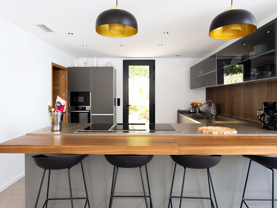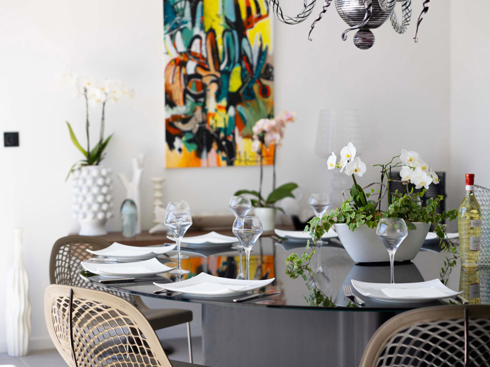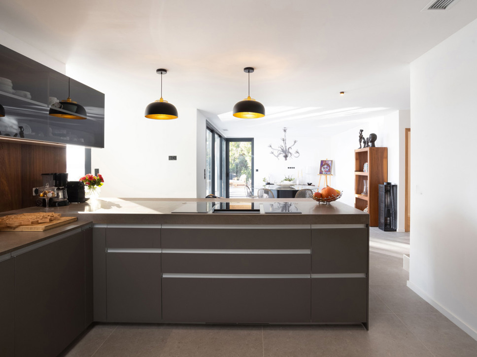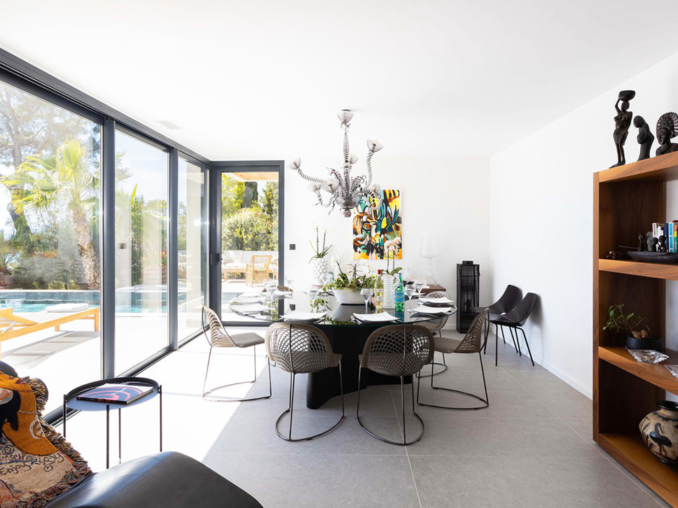 De living op de eerste verdieping is ruim en modern ingericht met meerdere zitmeubels (waaronder een zithoek van Minotti) en kunstvoorwerpen. De eetkamer beschikt over een eettafel met een design Octopus-lamp van Murano (Venetiaans glas). Vanuit zowel de living als de eetkamer heeft u toegang tot het terras en het zwembad. De moderne keuken is royaal opgezet en volledig uitgerust. De living en eetkamer zijn voorzien van airconditioning.