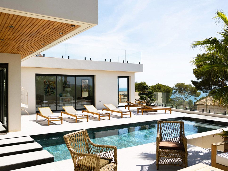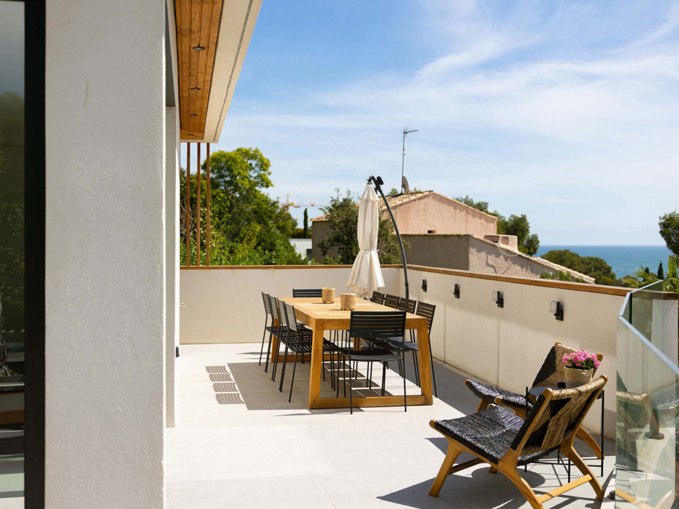 Deze villa beschikt over 2 royale terrassen vanwaar een prachtig zeezicht. Onder een grote parasol staat ook een eettafel vanwaar zich op de Middelandse Zee.