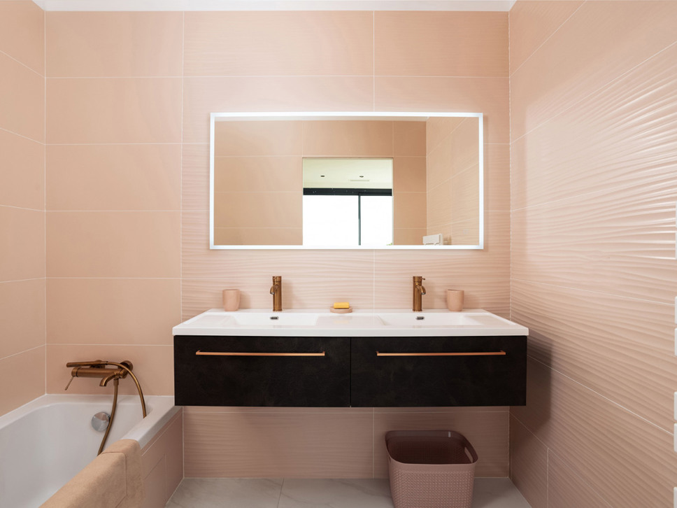 Slaapkamer 1, (eerste verdieping, niveau living en zwembad). Voorzien van een tweepersoonsbed (180x200). En-suite badkamer met ligbad, (regen)douche, wastafel en toilet. Vanuit de slaapkamer heeft u directe toegang tot het zwembad.