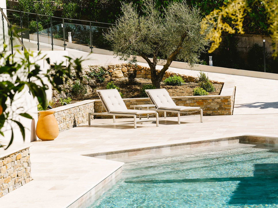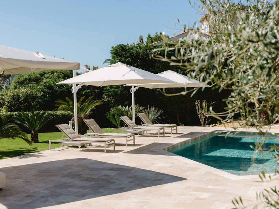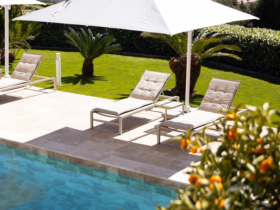 Het privézwembad meet 12,5 x 5 m en ligt een niveau lager dan het terras. Het zwembad wordt omgeven door een zonneterras met luxe ligstoelen en grote parasols. Het zwembad heeft een diepte van 2.0 m. en is voorzien van een zogenaamde plage (ondiep gedeelte) en het is verwarmbaar. De zonligging is goed, u geniet desgewenst de gehele dag van de zon.