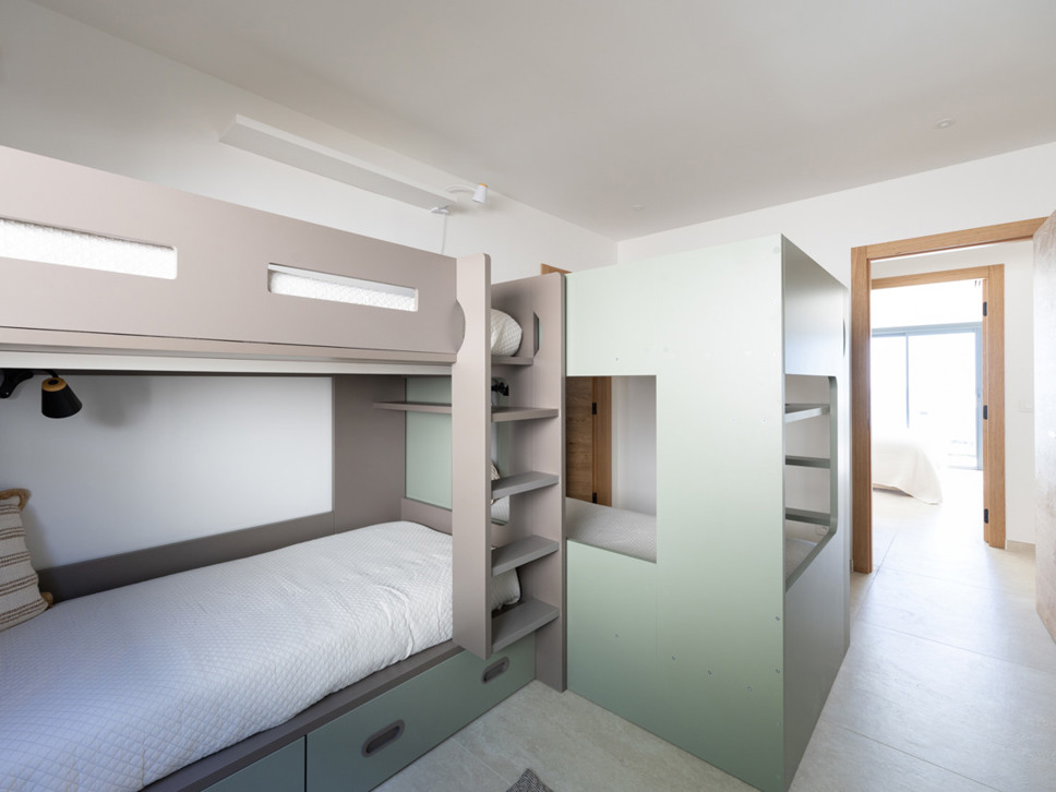 Slaapkamer 3 is uitgerust met twee eenpersoonsbedden 2x90x200. De badkamer is en-suite (wastafel, douche). TV is aanwezig. Slaapkamer 4 is de kinderslaapkamer. Dit vanwege de 2 - overigens zeer fraaie - stapelbedden. De matrassen zijn comfy en 90 cm breed en derhalve ook goed geschikt voor volwassenen. De afmeting per stapelbed is 2x90x200. TV is aanwezig.