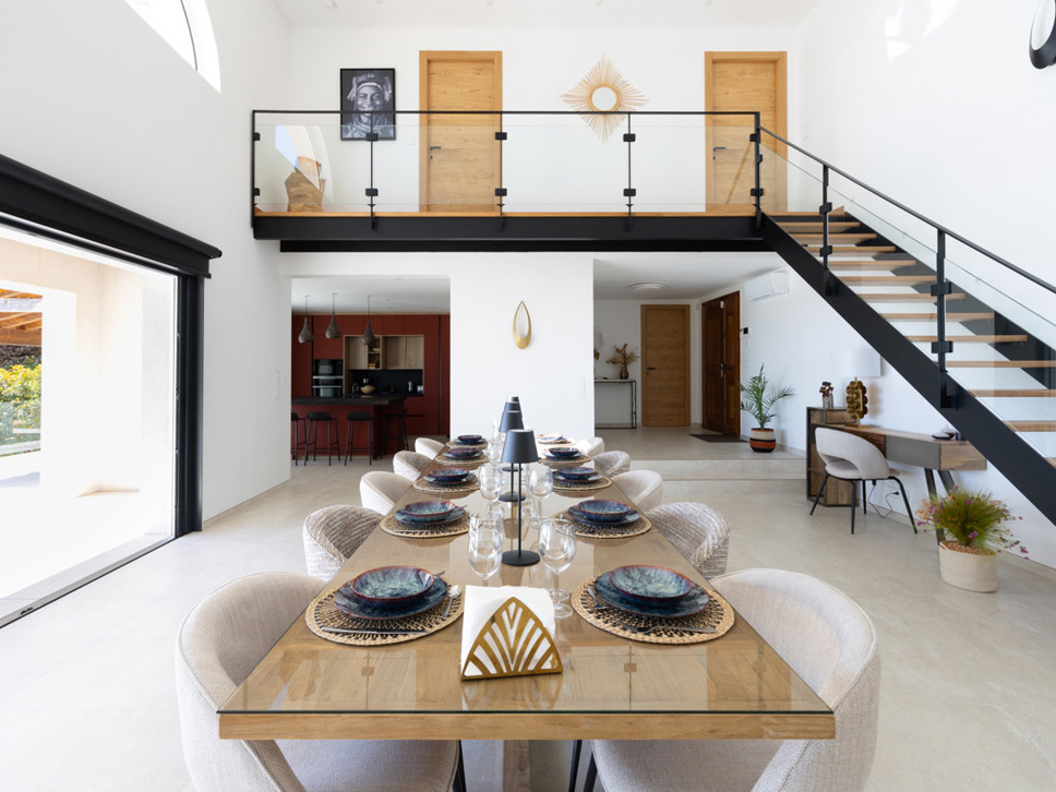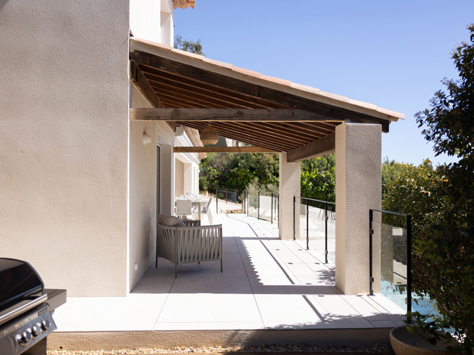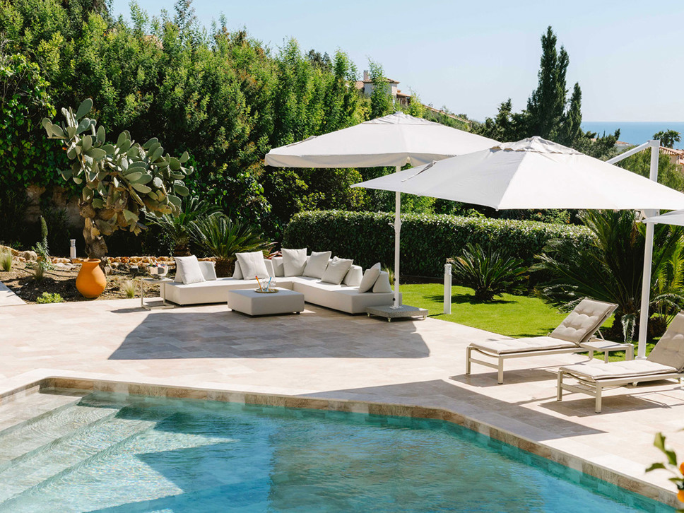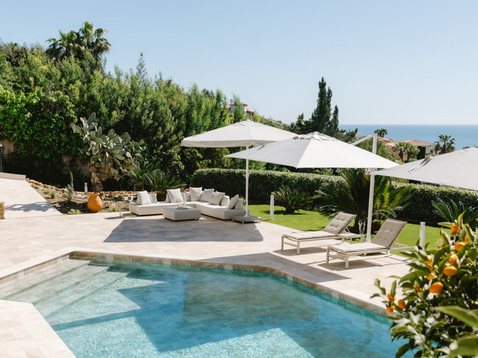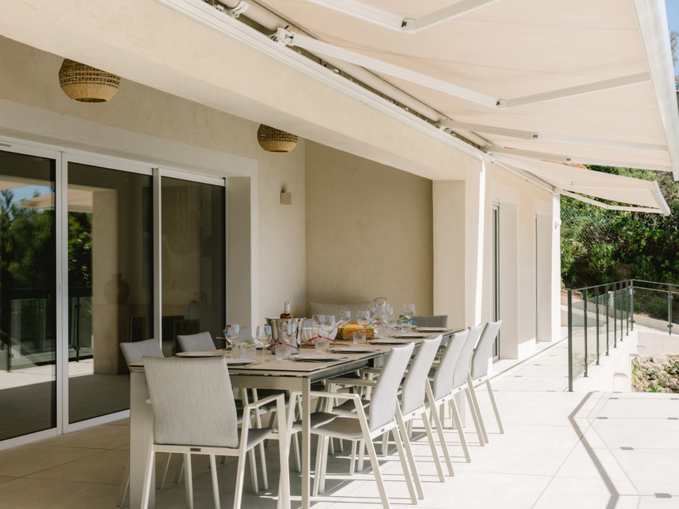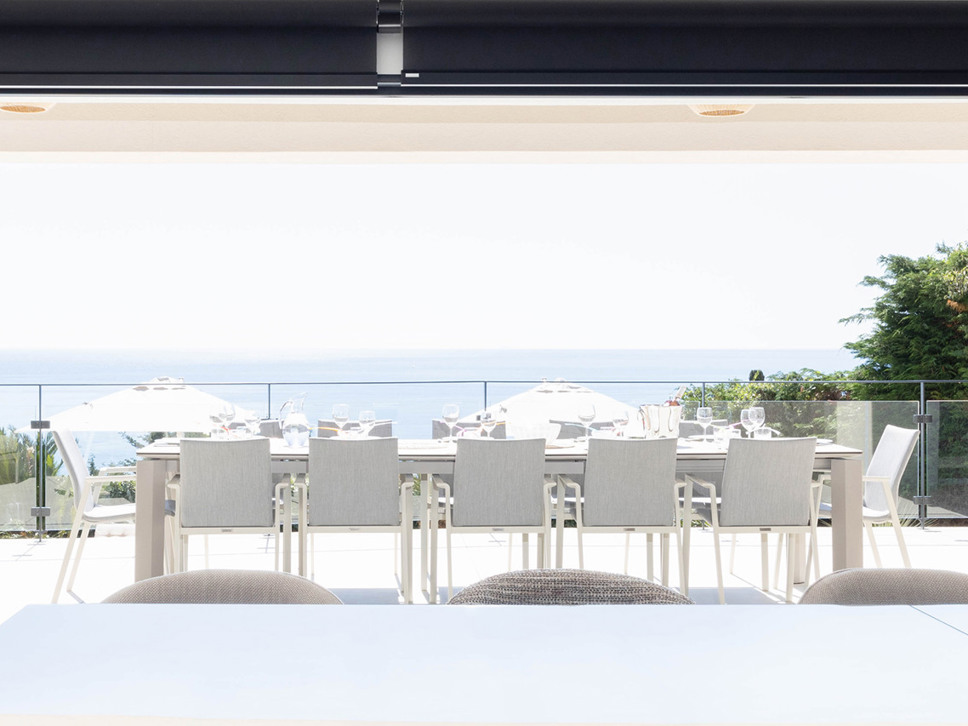 Wij zijn onder de indruk van de architectuur van de villa. Binnen en buiten lopen geraffineerd in elkaar over. Zie ook de prachtige foto vanuit de living kijkend naar de zee. Het terras in het verlengde van de living is royaal. Er zijn diverse terrassen (in de schaduw of in de zon). Op het overdekte terras, waar u vanuit de living toegang toe heeft, staat een luxe loungeset. Een fijne plek om even te relaxen en een boek te lezen.