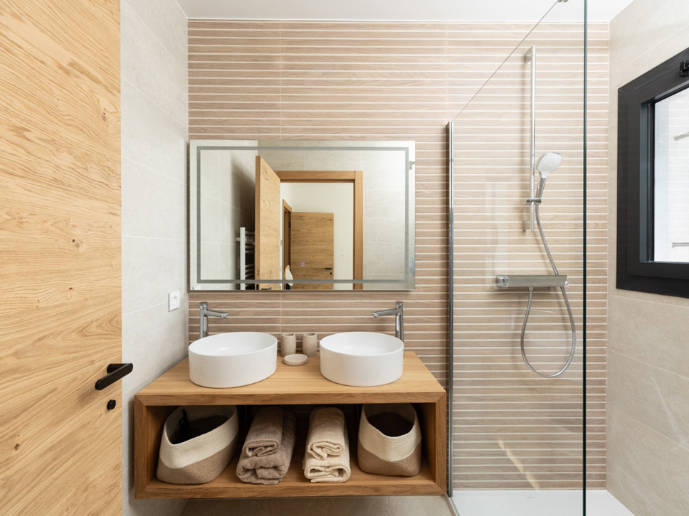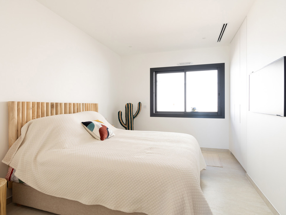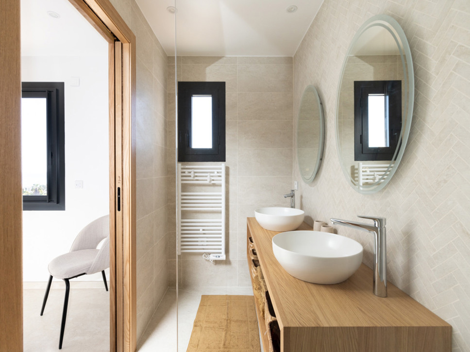 Op de begane grond; Slaapkamer 1 is gelegen aan de zeezijde van de villa en is voorzien van een tweepersoonsbed (160x200) met en-suite badkamer (douche en dubbele wastafel). Luxe inbouwkasten en een TV zijn aanwezig. Slaapkamer 2 is ook gelegen aan de terras en zeezijde. Het bed is tweepersoons (160x200) met en-suite badkamer (douche en dubbele wastafel). TV is aanwezig. Ook met luxe inbouwkasten.
