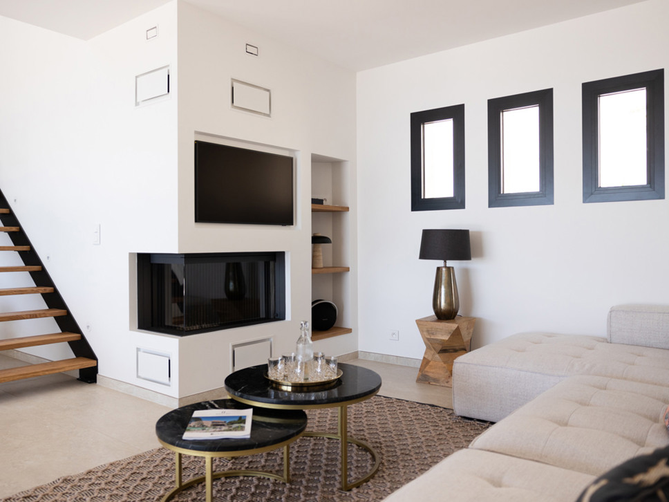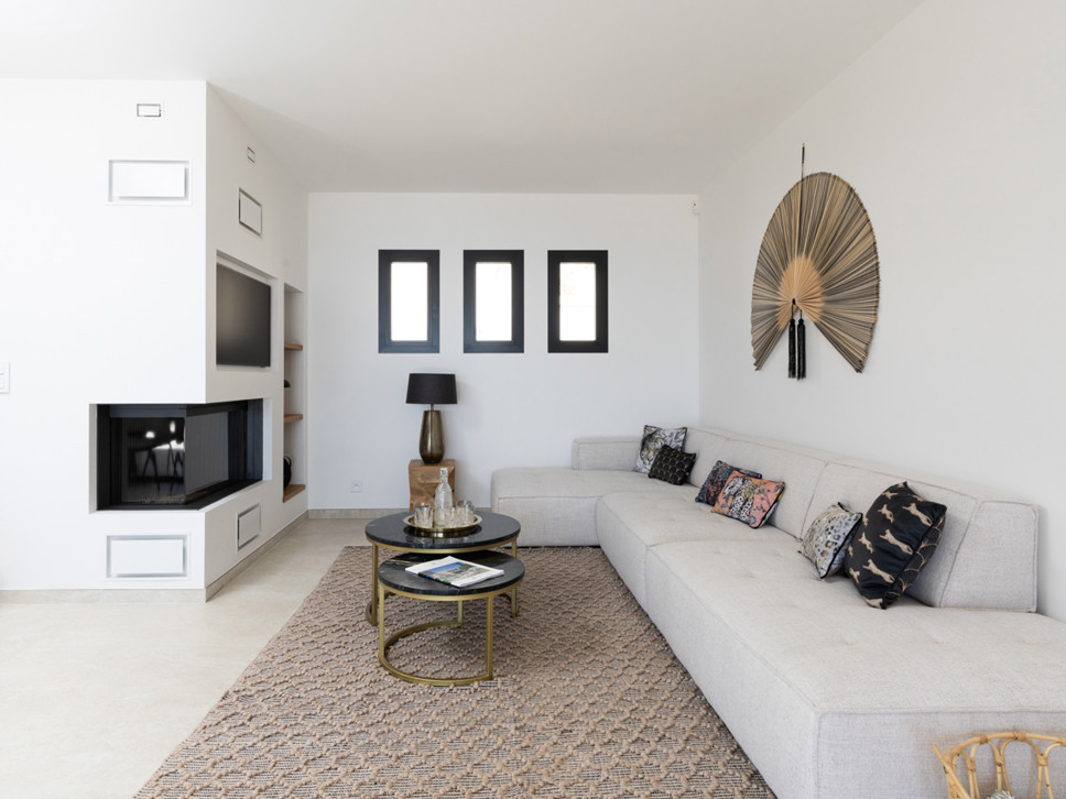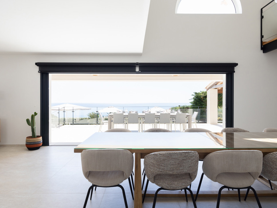 De living is licht, royaal en bijzonder fraai ingericht. Centraal staat de XL eettafel (10 p) vanwaar een heerlijk zicht op de Middellandse Zee. Er is een semi-separate TV-hoek. Overigens biedt ook elke slaapkamer de mogelijkheid om TV te kijken.