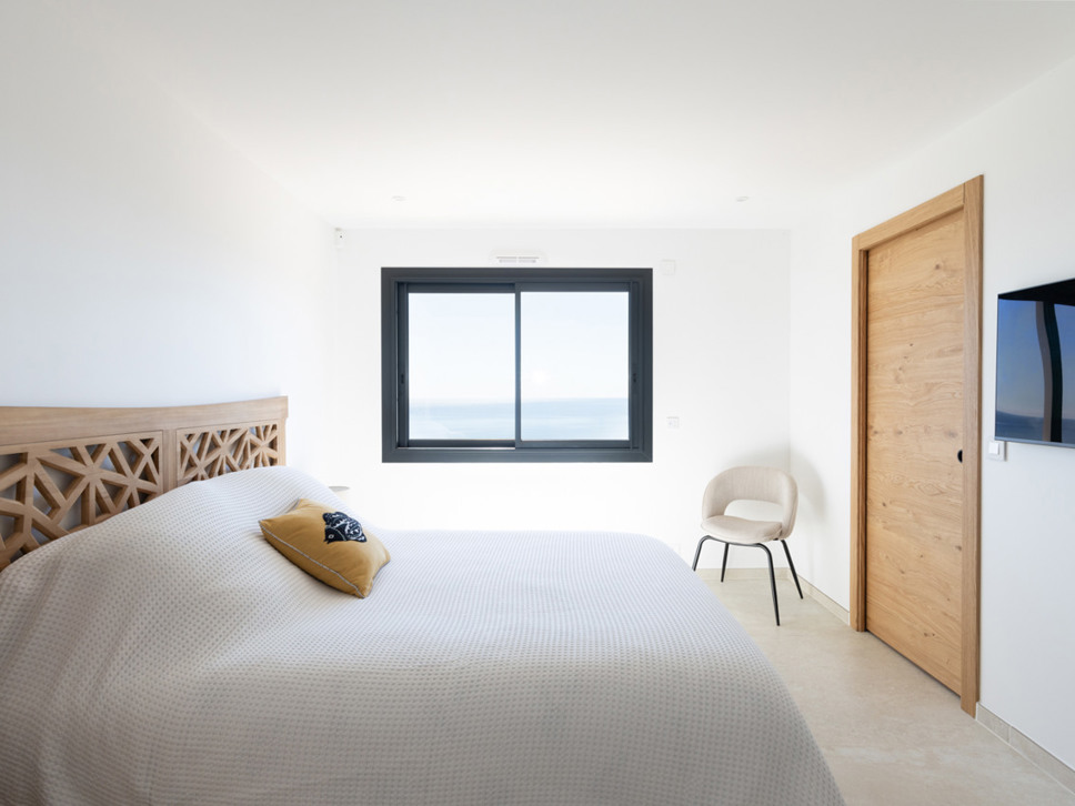 Slaapkamer 5 is gelegen op de 1e verdieping. Dit is een royale ouderslaapkamer met en-suite badkamer (inloopdouche, wastafel en separate WC) ) Het bed is tweepersoons 160x200. Ook voorzien van TV. Het uitzicht op zee is ons inziens zeer uitnodigend.