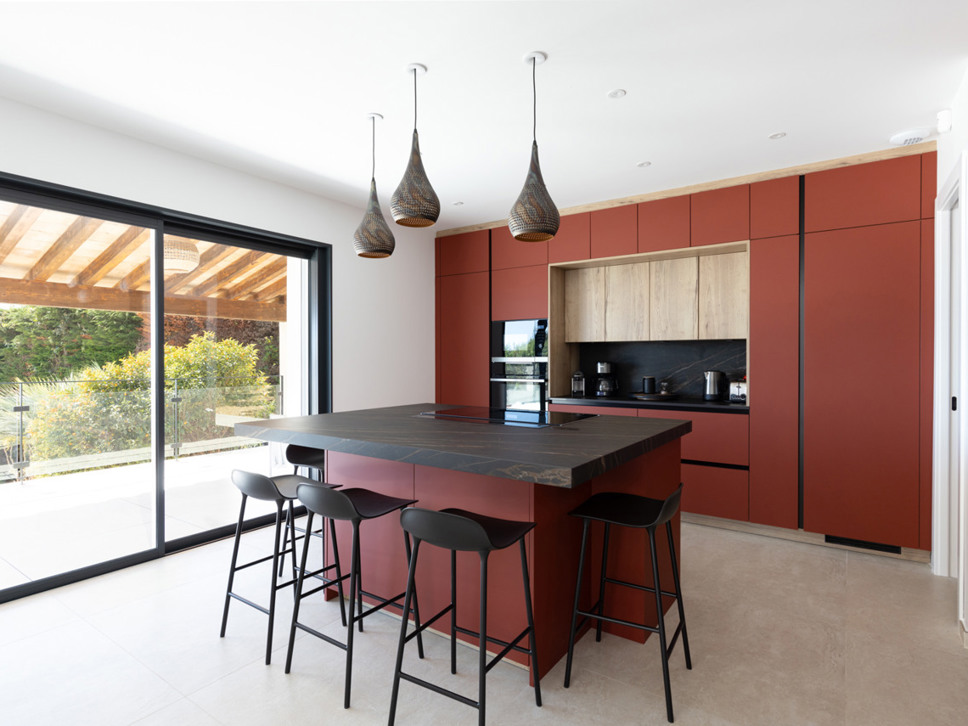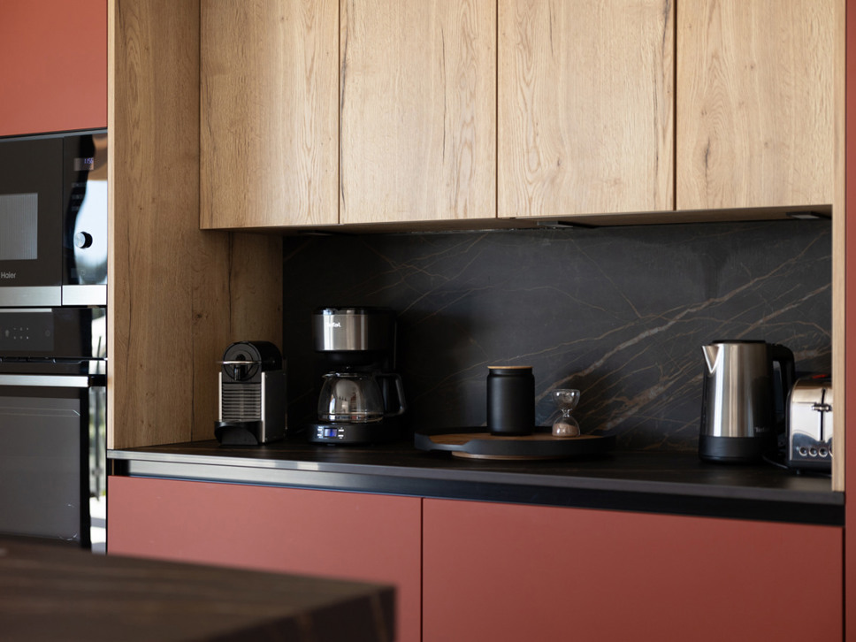 In het verlengde van de living bevindt zich de mooie "rode" keuken. Deze moderne open keuken is slim praktisch ingericht; zo biedt de bijkeuken direct toegang tot de parkeerplaats. Erg handig voor de boodschappen. Alles is voorhanden in de keuken zoals twee grote koelkasten, vaatwasser, Nespresso-apparaat etc etc.