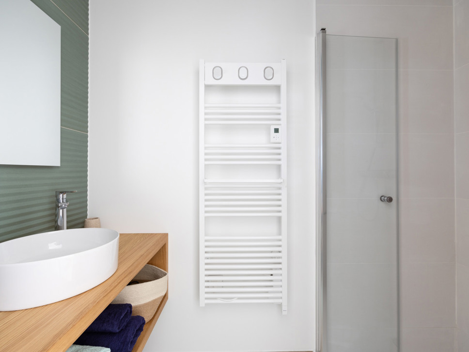 Mooi vinden we ook het kleurenspel. Het strakke wit van de facade, de rode keuken, de kleurrijke badkamers en het blauw van het zwembad en de zee. Dit huis is een feestje voor het oog.