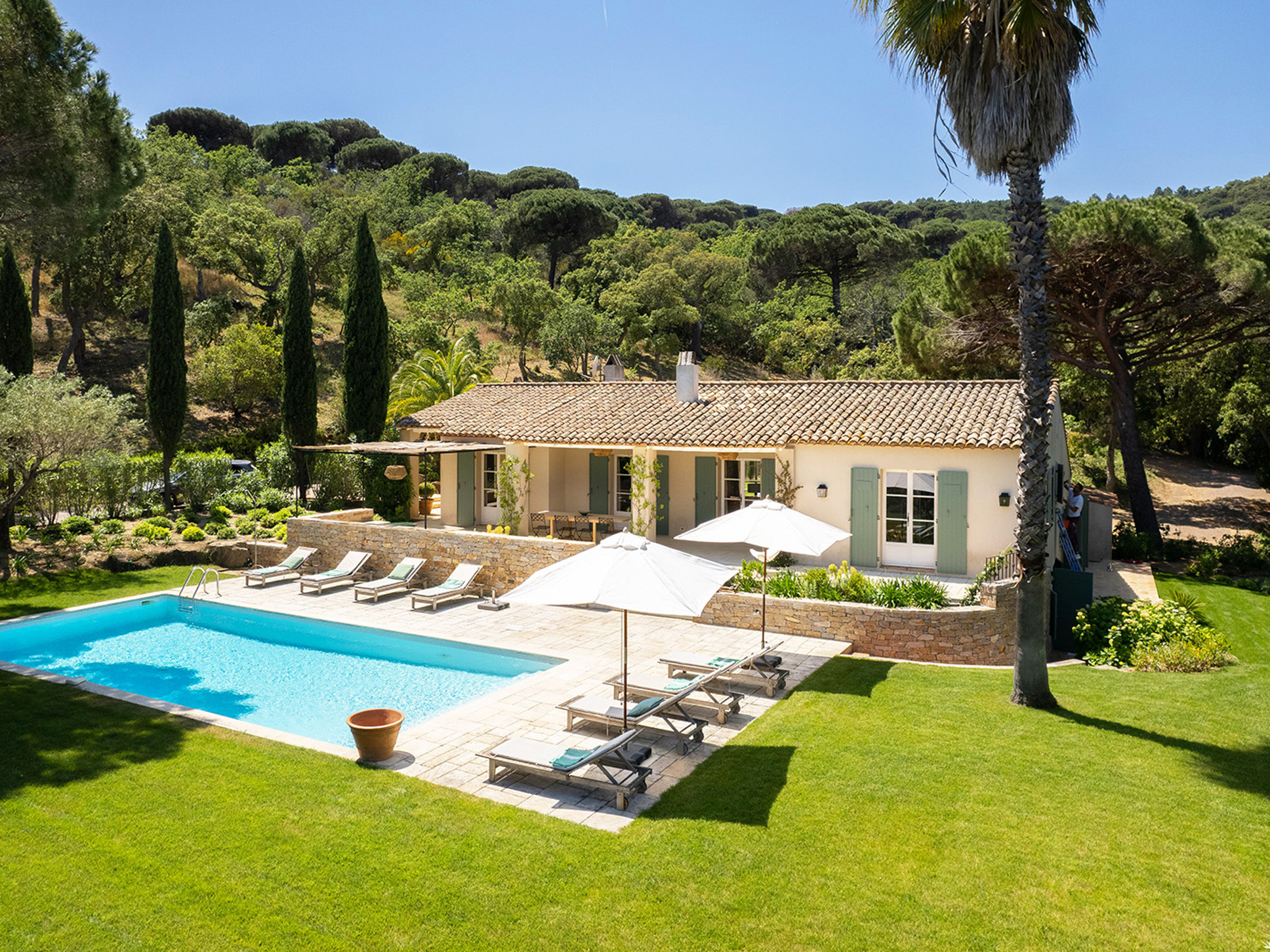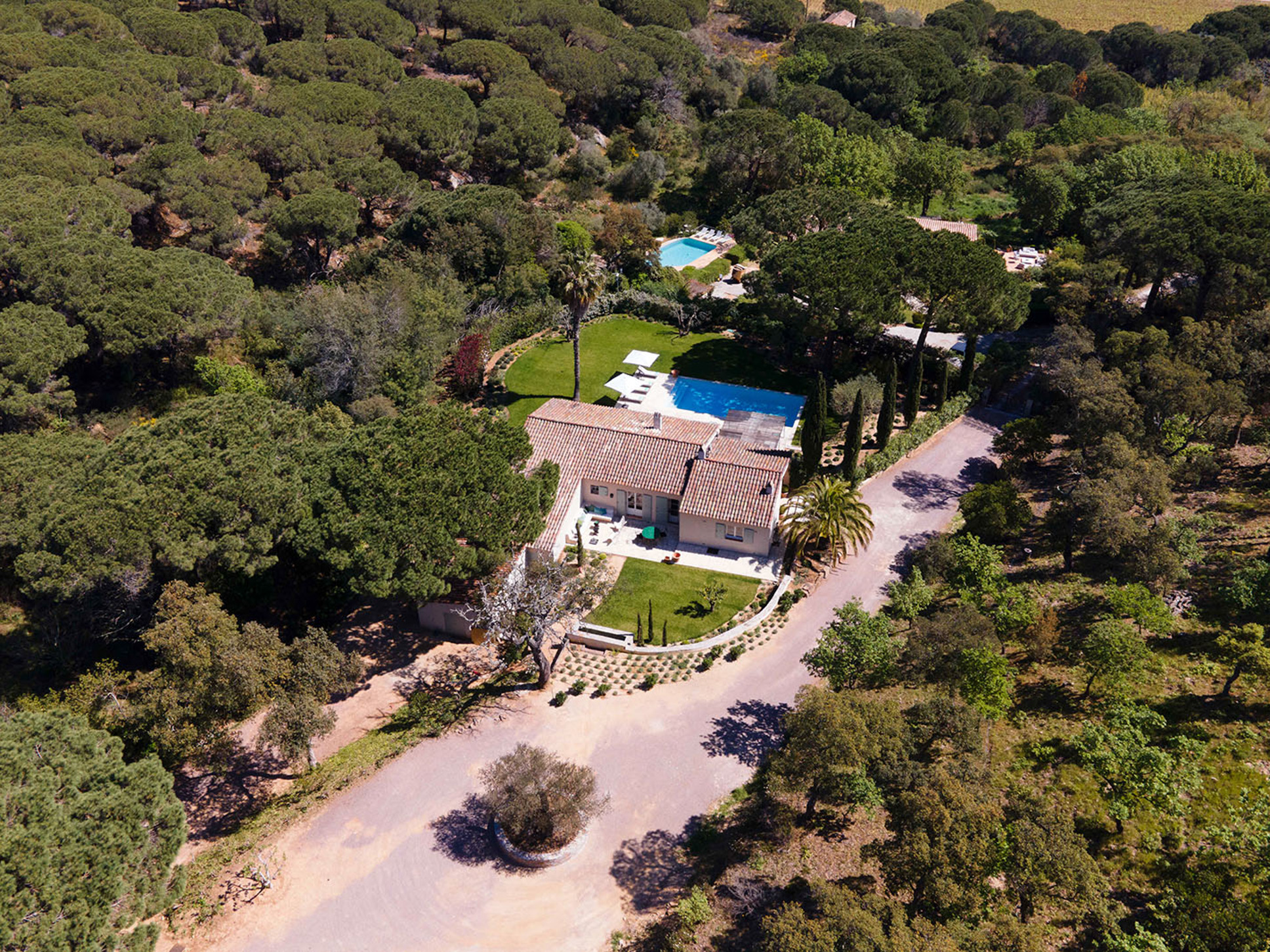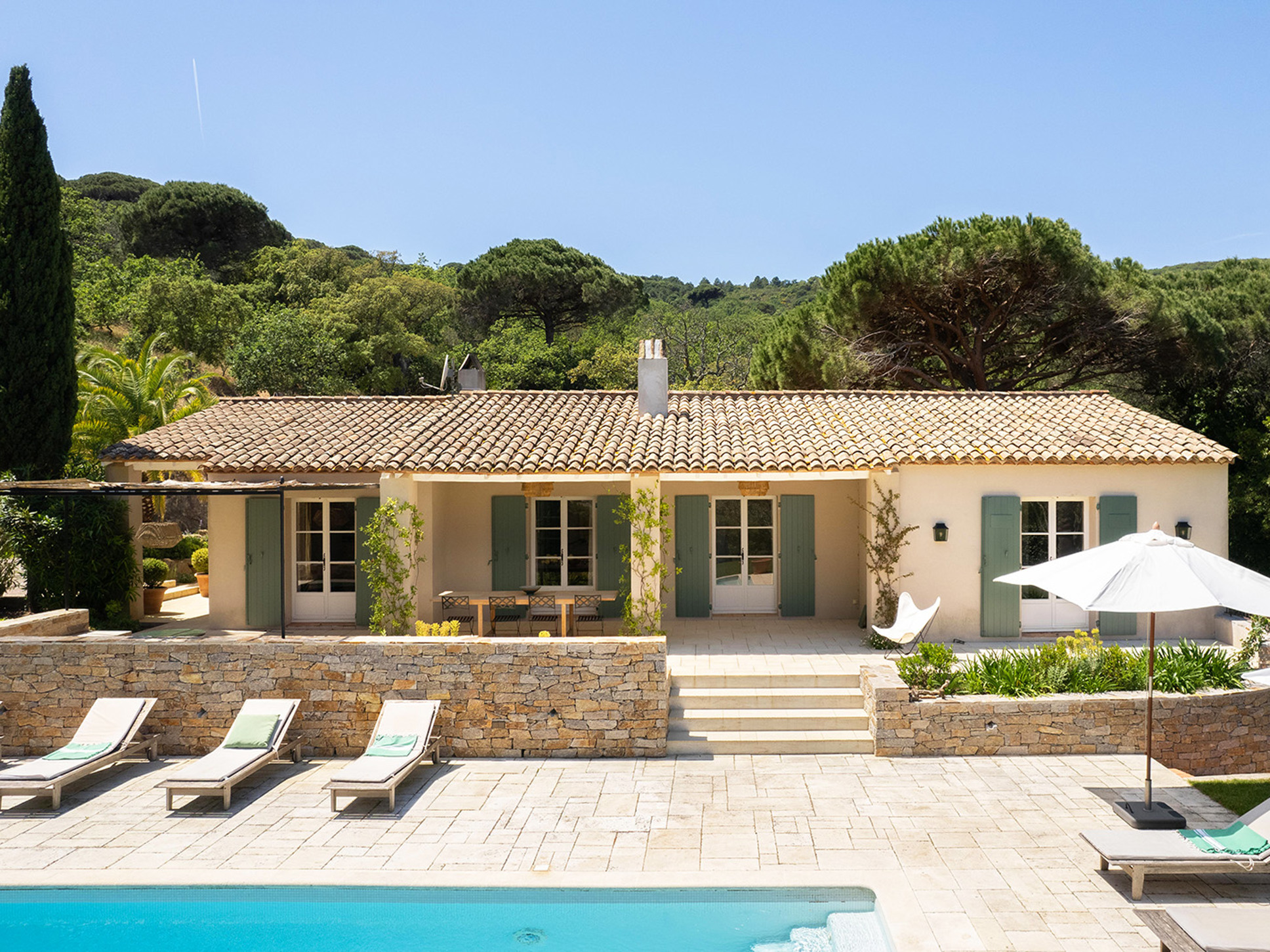 Een paar treden omlaag en u komt bij het zwembad (11 x 5 m). Azuurblauw water, grote Pins Parasol en comfy ligbedden completeren het luxe Zuid-Frankrijk gevoel.