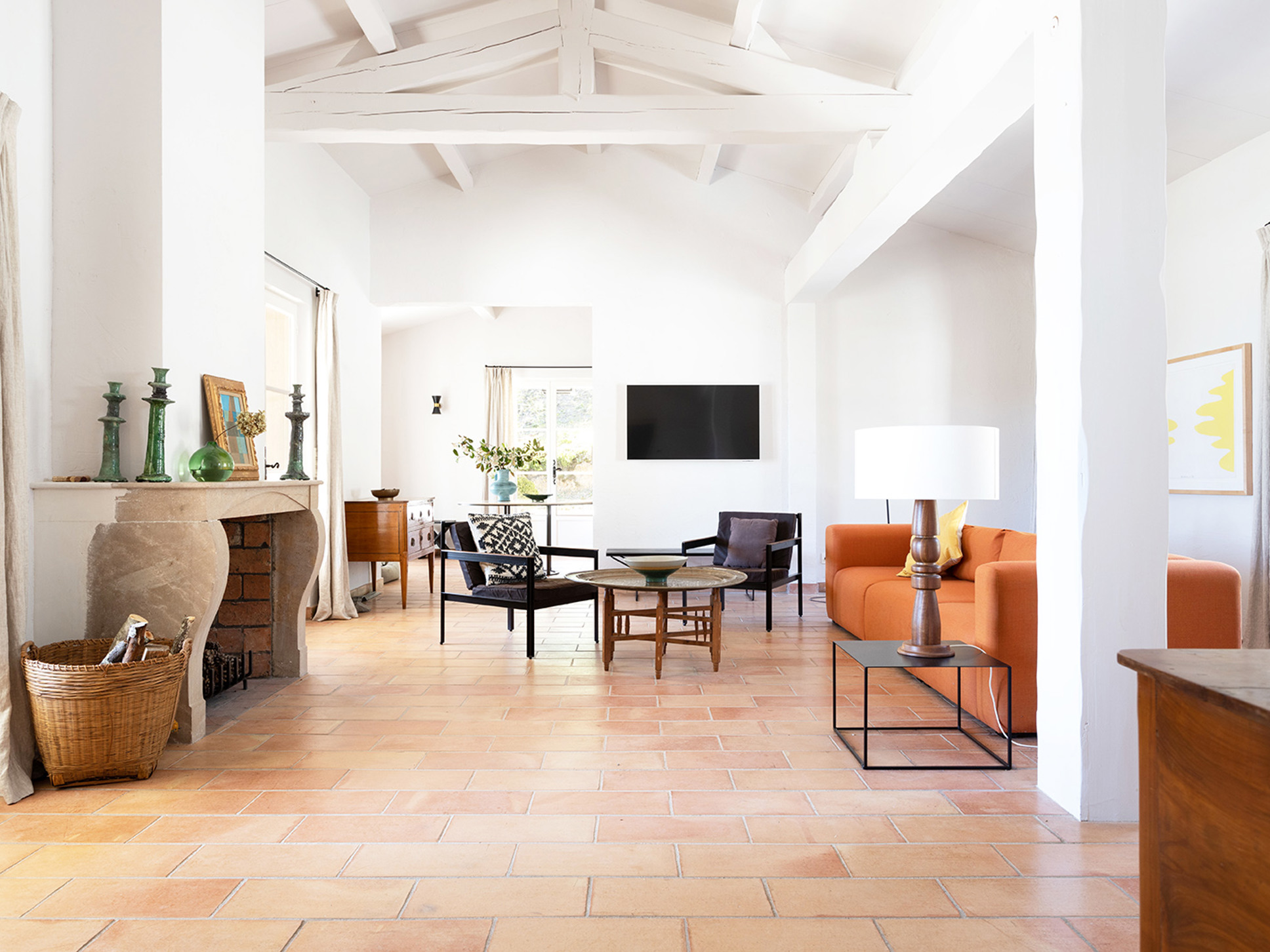 De living is licht, ruim van opzet en ingericht met designmeubels en kunst aan de muren. In het verlengde van de living bevindt zich de compleet ingerichte keuken, die direct toegang biedt tot het terras aan de voorzijde, overdekt met een pergola. Vanuit de living leiden openslaande tuindeuren naar het natuurstenen terras, de tuin en het zwembad.