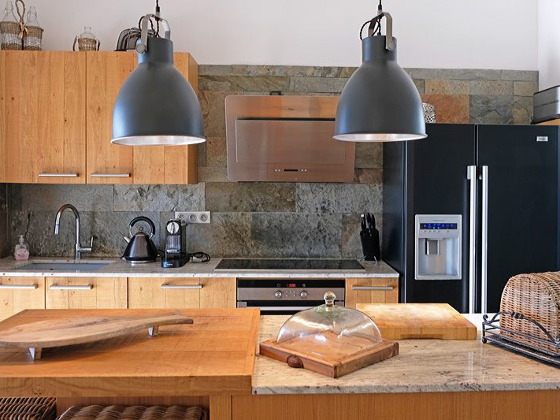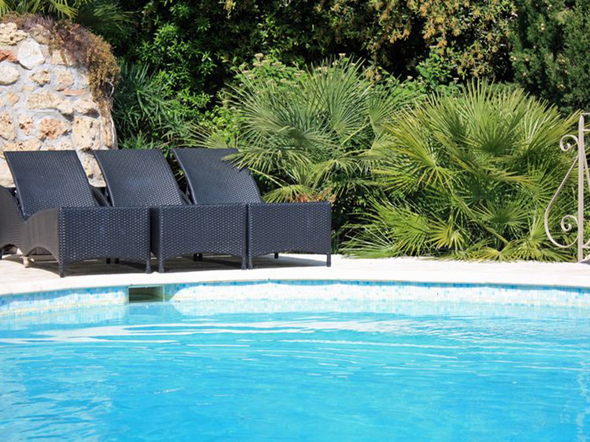Vanaf dit terras loopt een trap naar beneden naar het niervormige zwembad. Langs het zwembad staan zonnebedden en parasols. Op het niveau van het zwembad is er een leuke zomerkeuken. Erg handig zo dicht bij het zwembad. Er is een koelkast, stromend water en volop servies. Het gastenverblijf (slaapkamer 5) bevindt zich ook op dit (zwembad) niveau.
