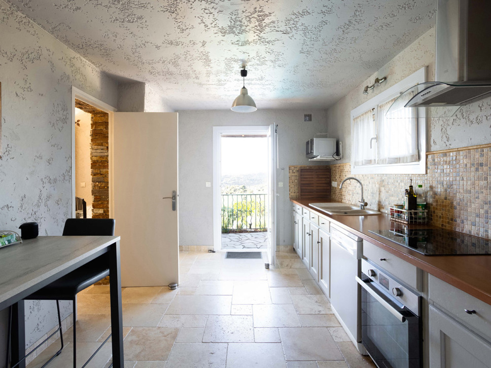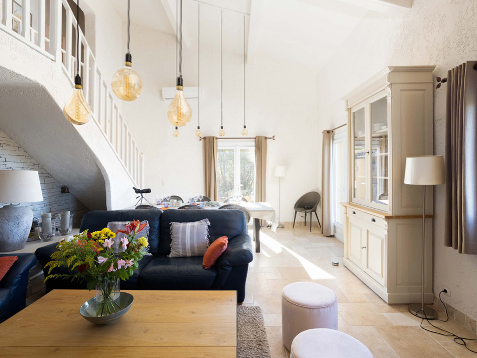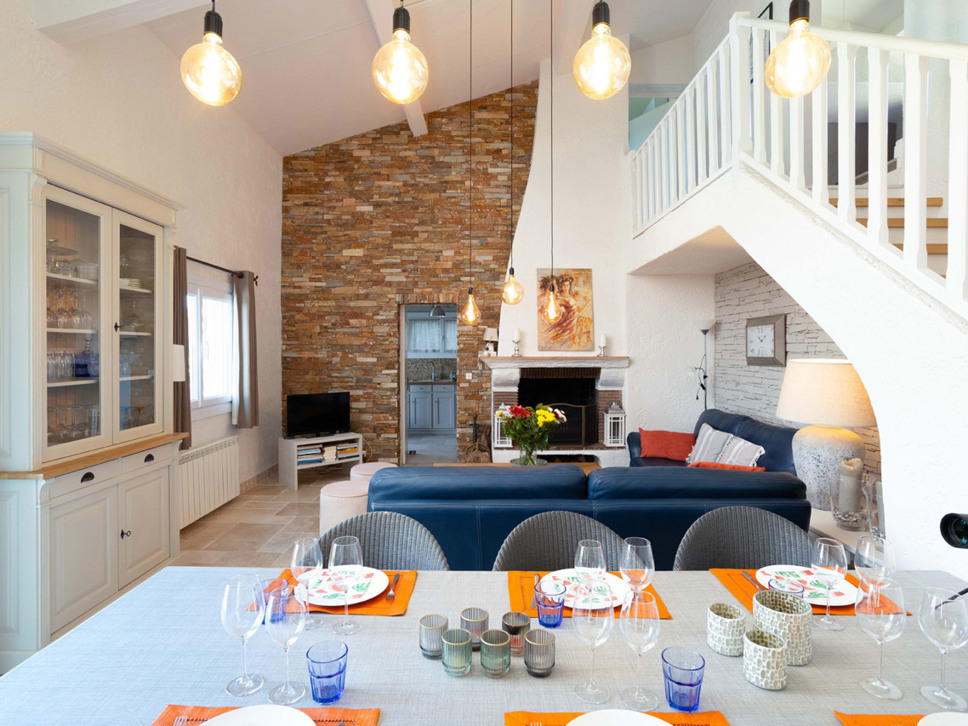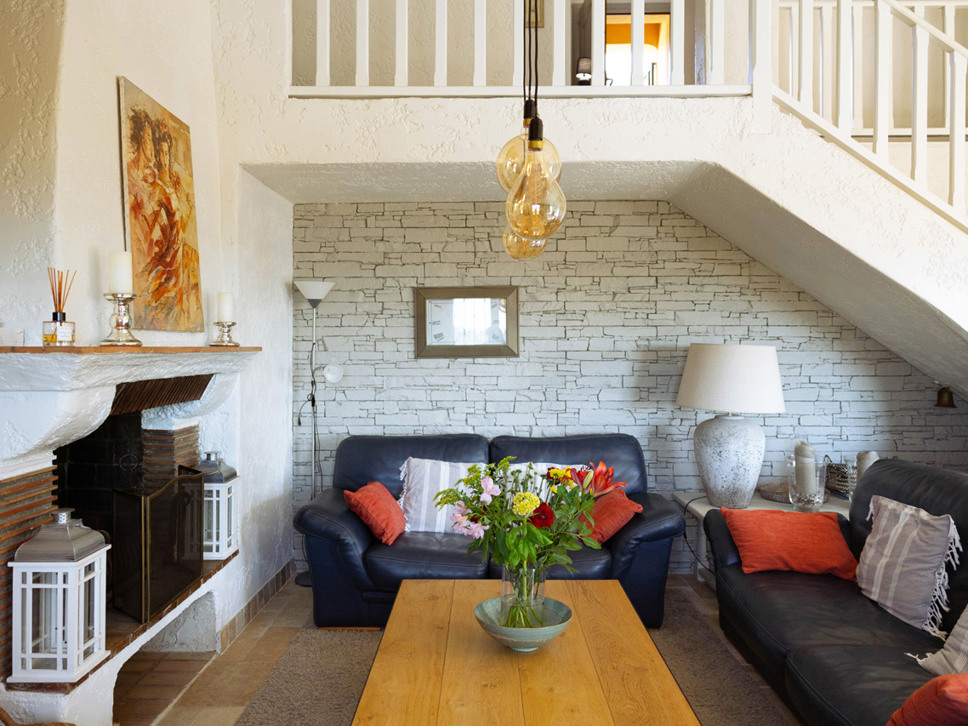 De living met comfortabele zitmeubelen heeft een grote open haard. Er is een LCD TV met satelliet (NL en BE kanalen) en een DVD speler aanwezig. De sfeervolle living van de villa bevindt zich op het niveau van het zwembad. Met name het gebruik van eigentijdse kleuren spreekt ons erg aan. In de living vindt u naast een leuke buffetkast een eettafel met 8 stoelen. De semi open keuken is voorzien van allerlei apparatuur waaronder een vaatwasser, oven en magnetron.