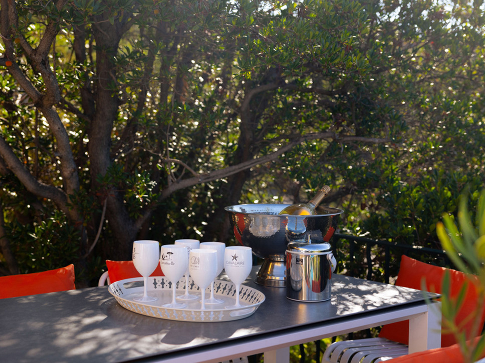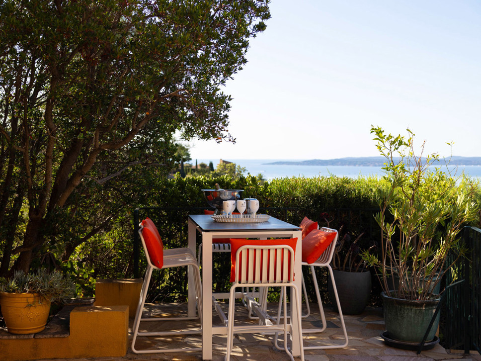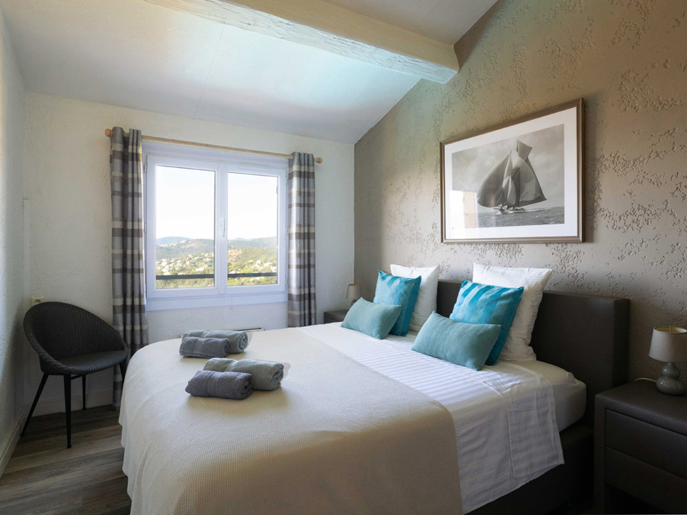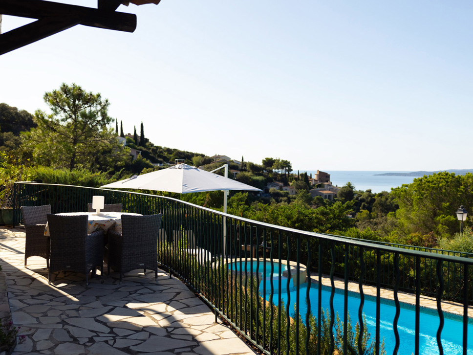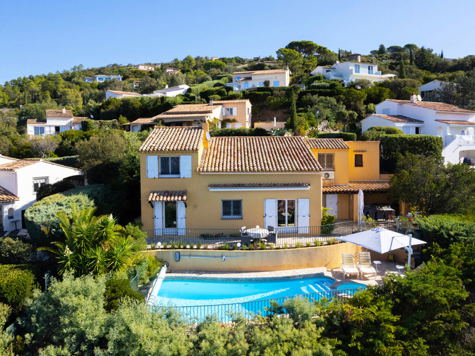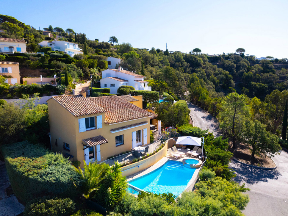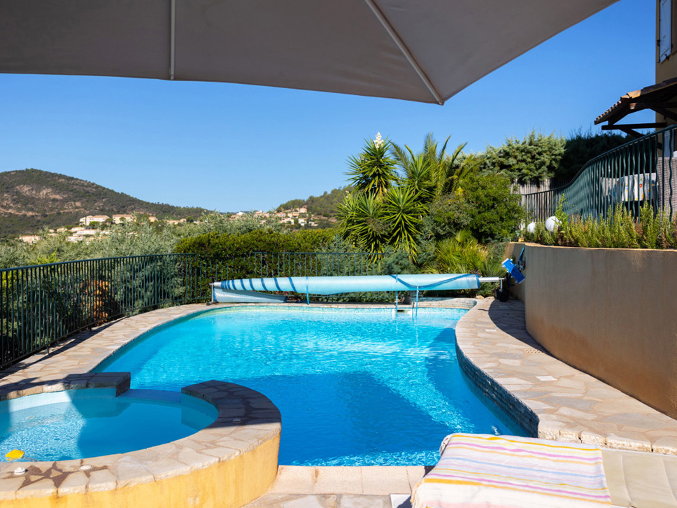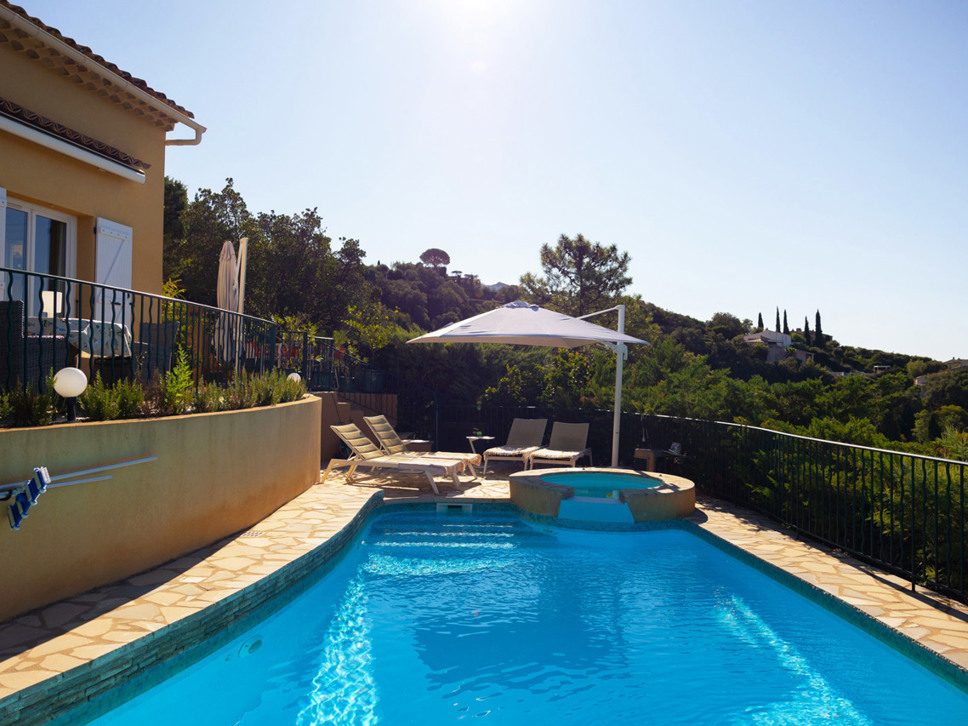 Het zwembad (niervormig) is ongeveer 9 x 4,5 m en is voorzien van een romeinse trap en jacuzzi. Het zwembad ligt een niveau lager en is volledig afsluitbaar met een hekwerk. Op het terrein is parkeerplaats aanwezig voor 1 auto. De straat biedt tevens voldoende parkeergelegenheid. Het panoramische uitzicht op de Golf van St Tropez maakt de woning tot een heerlijke vakantiebestemming.