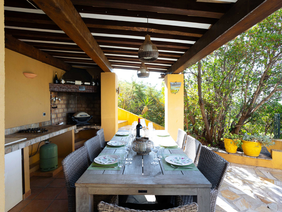 Het natuurstenen terras met zomerkeuken en zwembad kunt u makkelijk bereiken vanuit zowel de living, de keuken als de slaapkamer. Erg prettig is het overdekte gedeelte van het terras. Hier bevindt zich een zomerkeuken met stromend water en BBQ. Op het terras staat een teakhouten eettafel voor 8 personen. Het op het zuiden gerichte terras heeft een uitstekende zonligging.