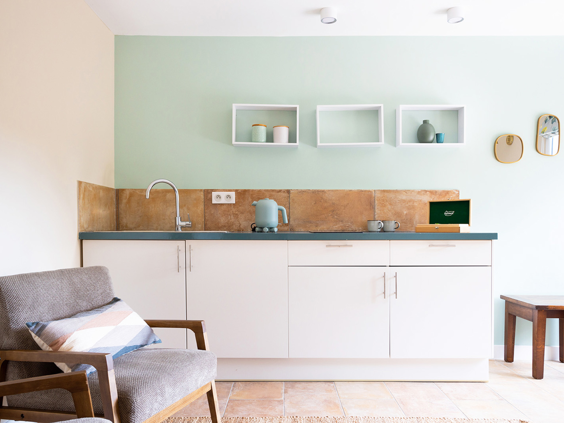 Slaapkamer 4 is een studio en is enkel buitenom te bereiken. Naast een tweepersoonsbed 160x200 biedt deze leuk ingerichte studio een badkamer (douche en WC) en een fraaie kitchenette inclusief Nespresso koffiezetapparaat en waterkoker.