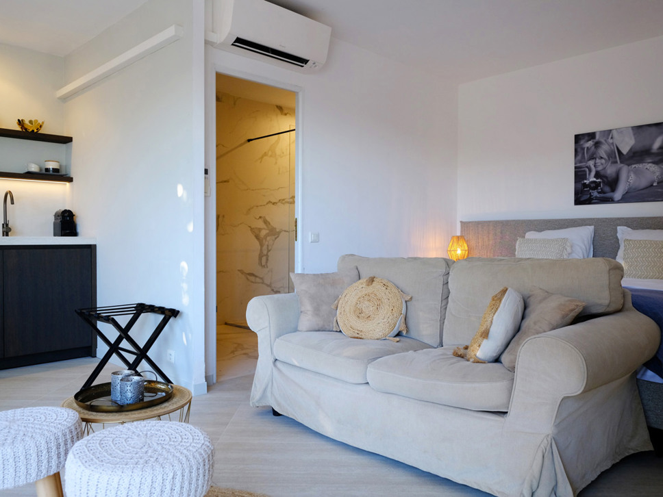 Slaapkamer 5 bevindt zich op het niveau van het zwembad en vormt een royale studio met eigen living, kitchenette en slaapkamer met een tweepersoonsbed (180x200). De en-suite badkamer is uitgerust met douche en separaat toilet. Vanuit deze kamer loopt u desgewenst zo het zwembad in.