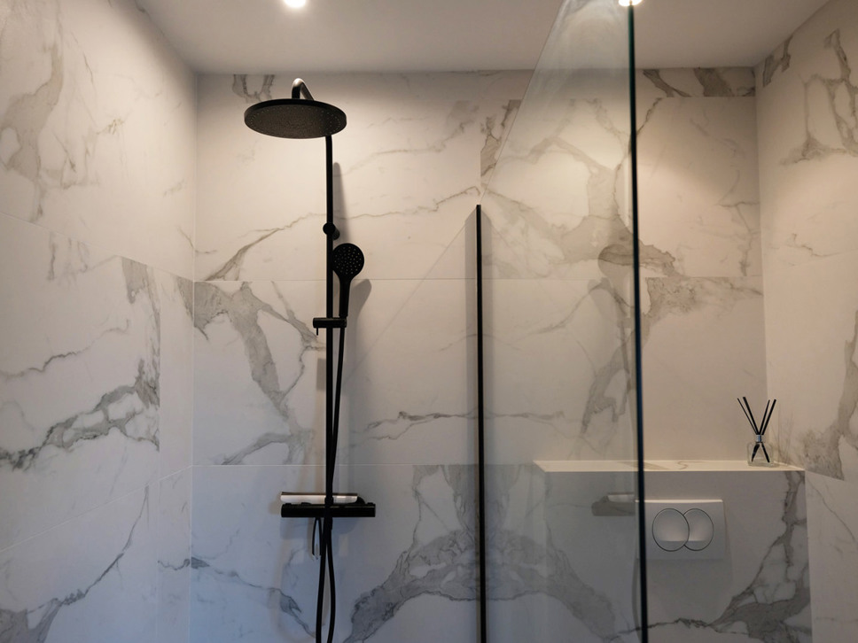 Slaapkamer 4 ligt eveneens op de begane grond en heeft een aparte ingang, ideaal als gastenkamer. De kamer beschikt over een tweepersoonsbed (160x200) en een en-suite badkamer met douche.