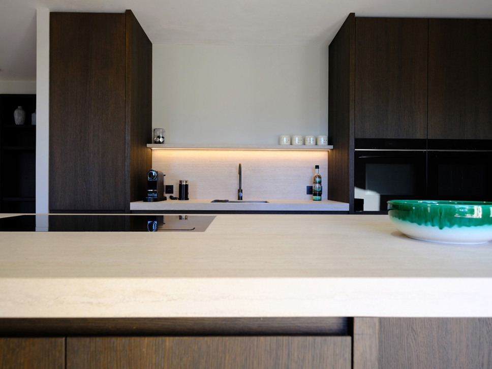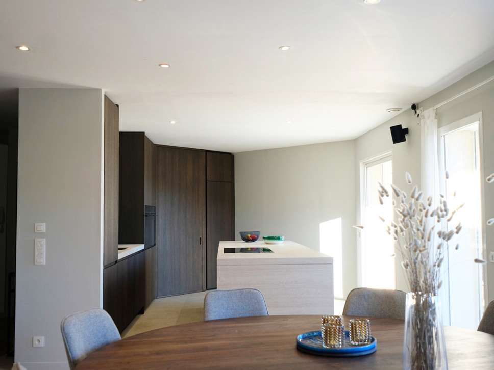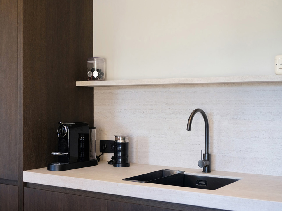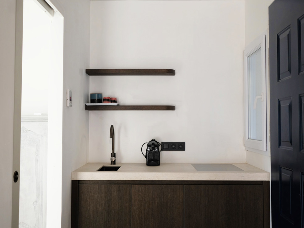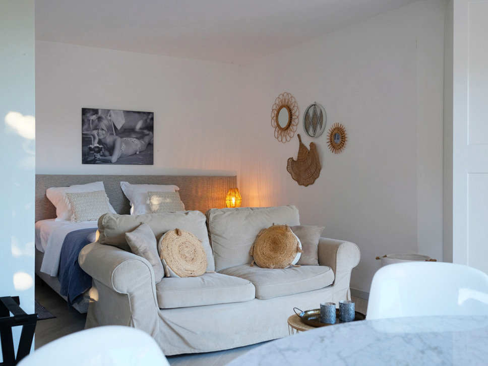 De living is ingericht met een zeer comfortabele zithoek en loopt over in een ruime, moderne keuken. Via de schuifdeuren bereikt u het terras, waar u kunt ontbijten in de ochtendzon terwijl u geniet van het schitterende zeezicht. De keuken is volledig uitgerust met onder meer magnetron, oven/grill, vaatwasser, waterkoker en een Nespresso-apparaat.