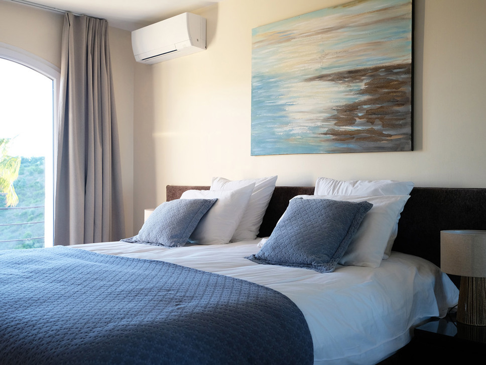 De villa beschikt over 5 slaapkamers, elk met een en-suite badkamer, verdeeld over de drie woonlagen. Alle slaapkamers zijn voorzien van airconditioning.