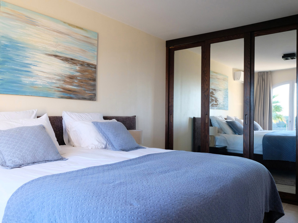 Slaapkamer 1 bevindt zich op de eerste verdieping en is ingericht met een tweepersoonsbed (180x200). De en-suite badkamer beschikt over een douche en toilet. Vanuit de kamer heeft u toegang tot het balkon met een prachtig uitzicht op zee.