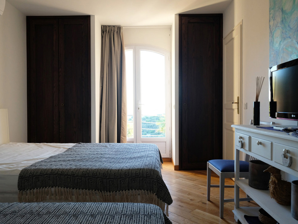 Slaapkamer 2 ligt eveneens op de eerste verdieping en beschikt over twee tweepersoonsbedden (2x140x200). Ook deze kamer heeft toegang tot het balkon met adembenemend zeezicht en een en-suite badkamer met douche en toilet.