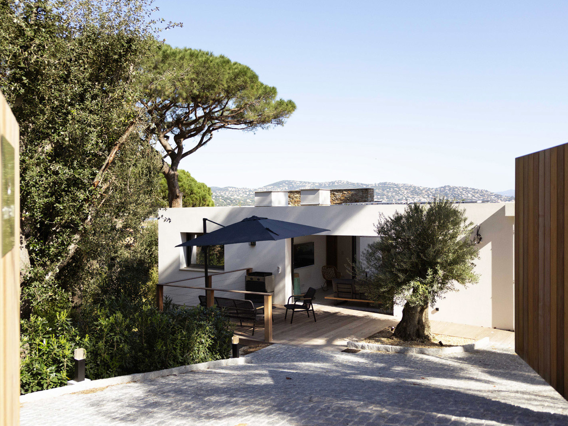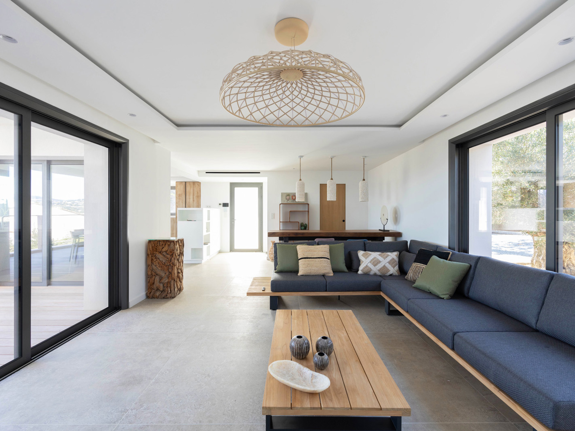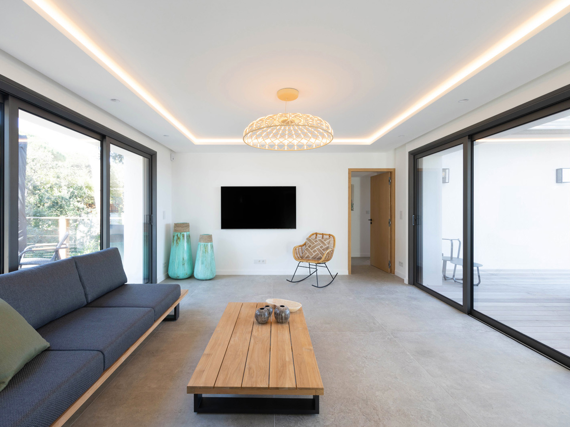 De living kenmerkt zich door luxe, strakke lijnen en vooral veel licht. Alles is ontworpen om optimaal te genieten van het Zuid-Franse klimaat. Fraai detail is dat de glazen puien aan weerszijden volledig in de muur weg te schuiven zijn, waardoor binnen en buiten naadloos in elkaar overlopen. De terrassen aan weerszijden van de living verdubbelen zo het woonoppervlak.
