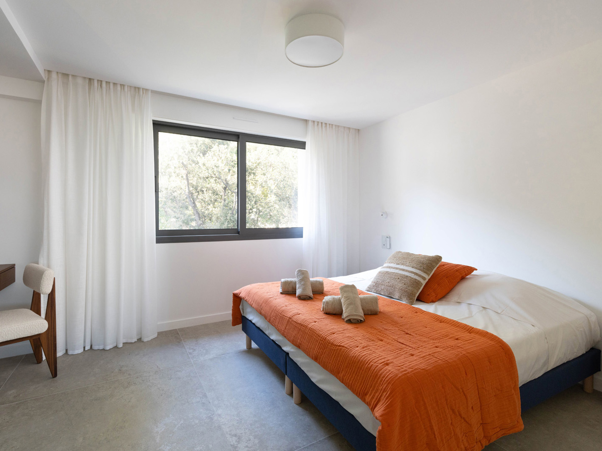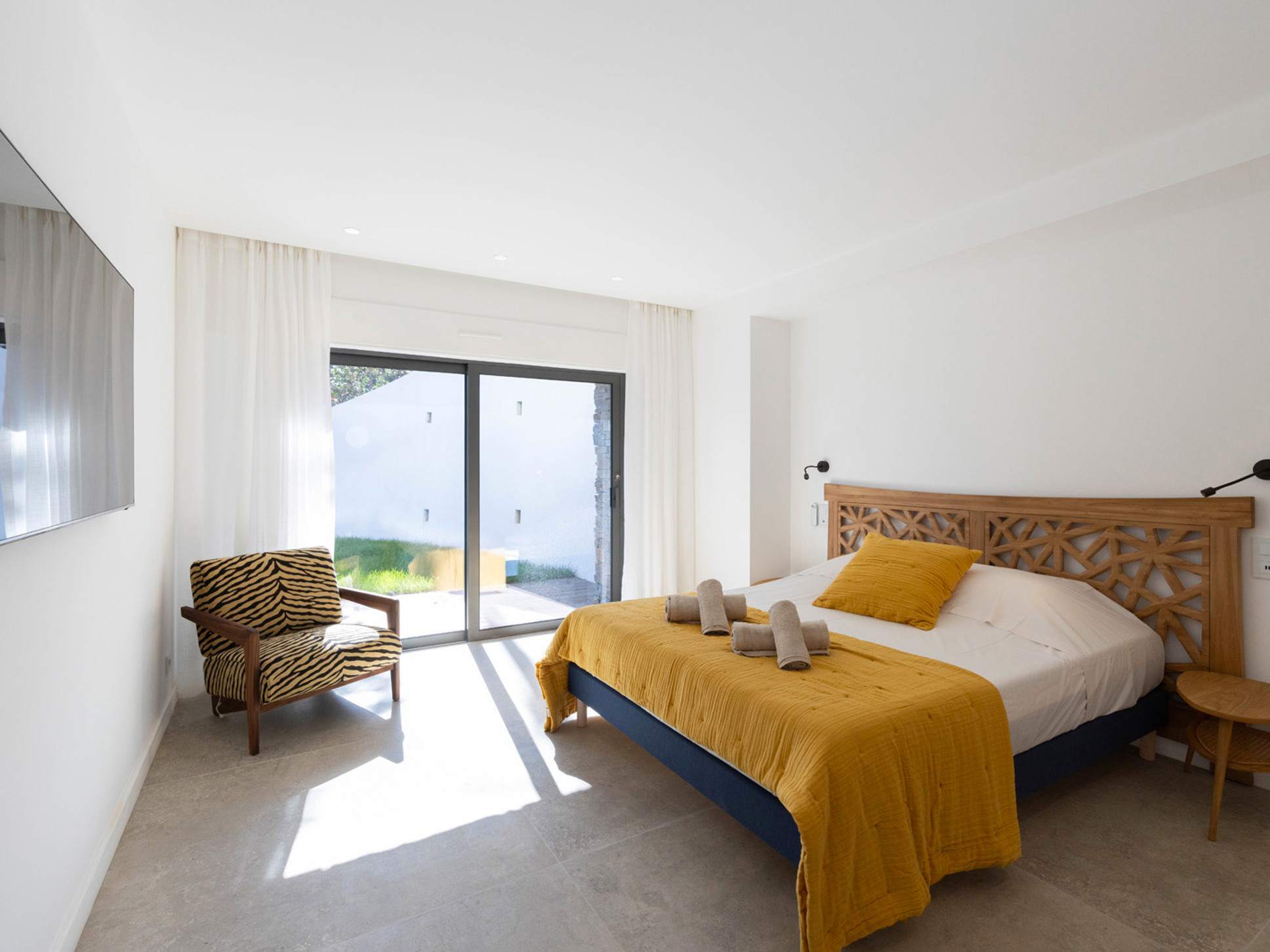 Slaapkamer 5, ligt ook op de benedenverdieping, is identiek aan slaapkamer 4 en heeft een oppervlakte van circa 18 m². Ook hier is een tweepersoons boxspring (180x210), inbouwkastruimte en een en-suite badkamer met dubbele wastafel, luxe inloopdouche en toilet aanwezig. Ook vanuit deze kamer heeft u directe toegang tot de tuin en het zwembad.